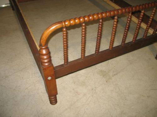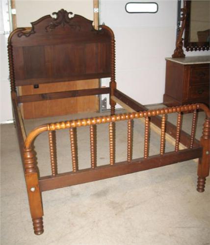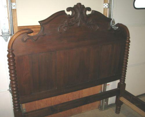 SOFTWOOD SPOOL BED. Ornately carved leaf decoration at headboard. Spool legs and footboard. 59” H, 53” W