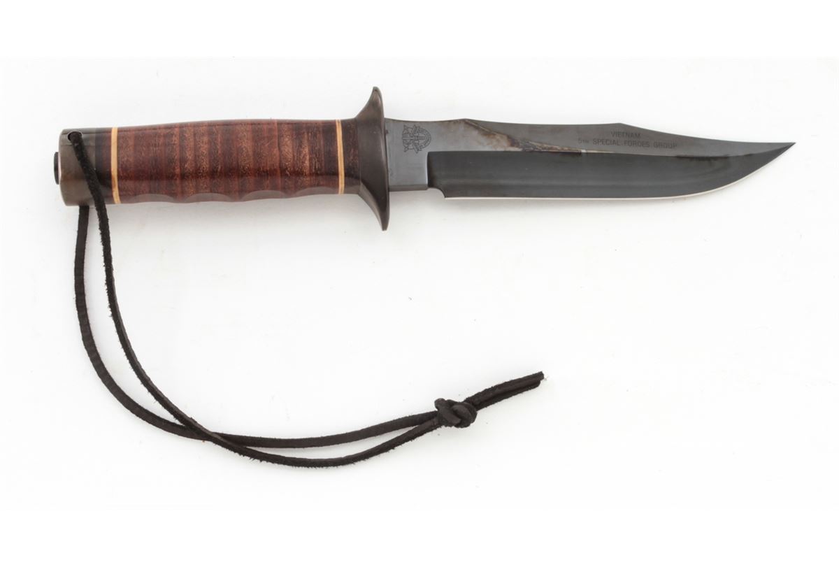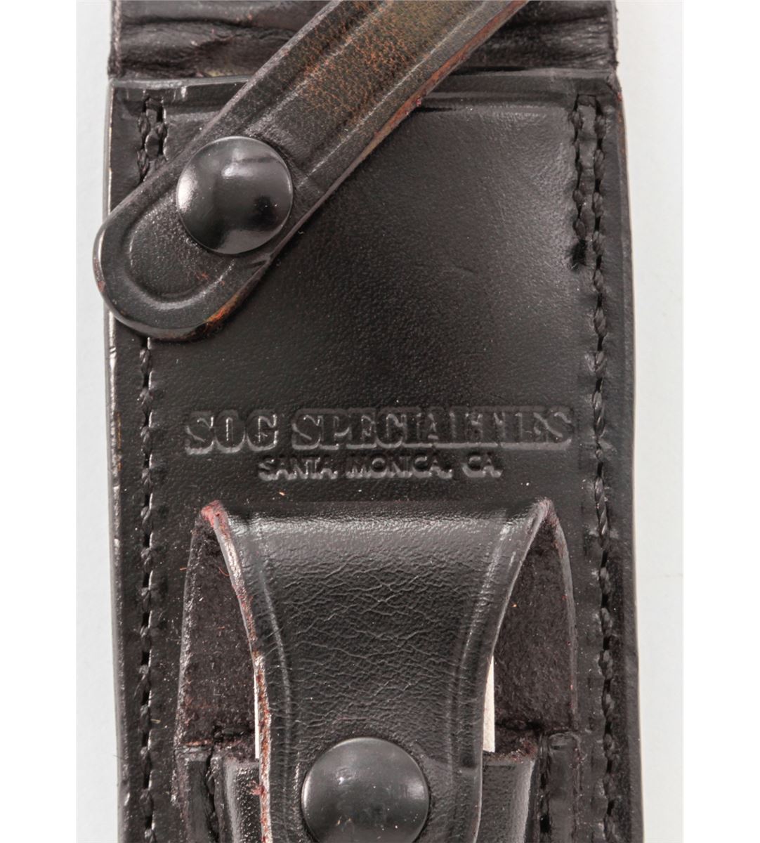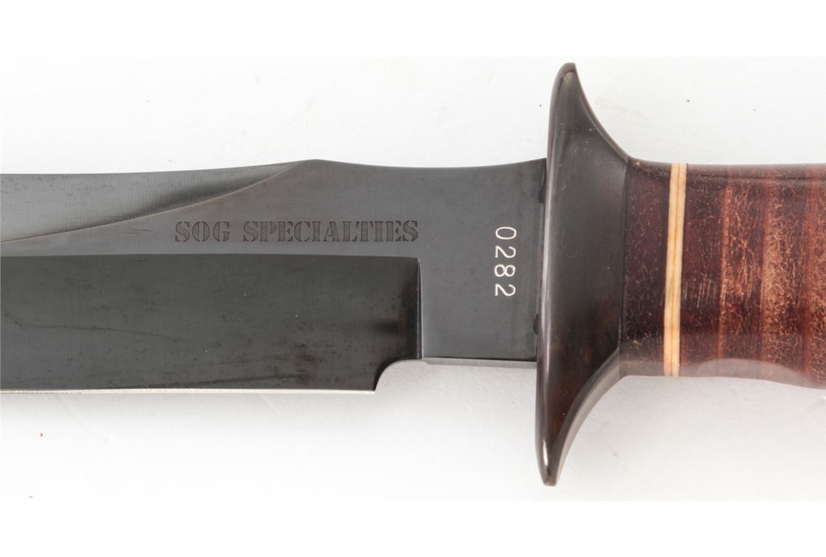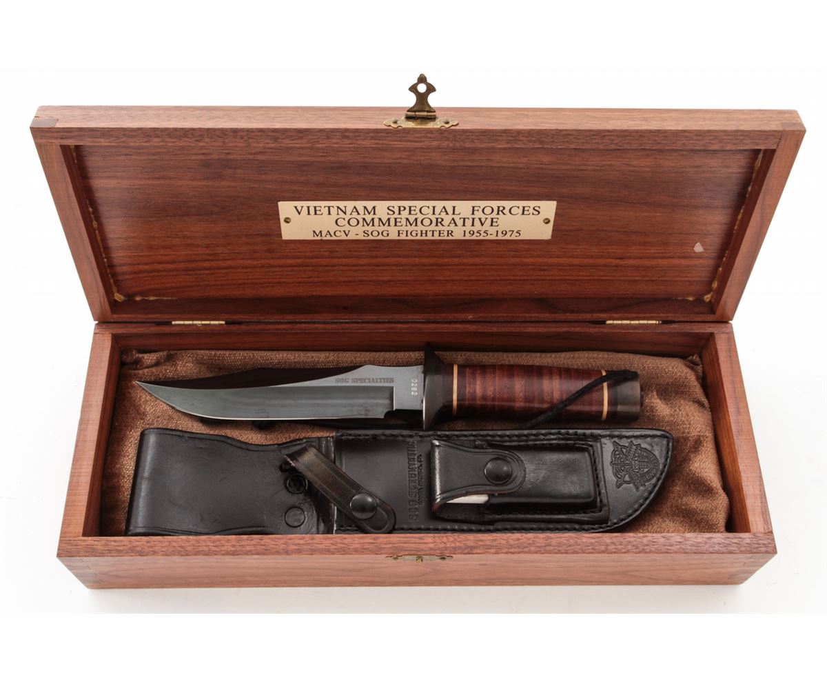 SOG Limited Edition Vietnam Special Forces Fighting Knife, 6-1/4'' dark blue/black blade marked ''SOG SPECIALTIES'' and serial number ''0282''; reverse marked ''VIETNAM/5TH SPECIAL FORCES GROUP''; ricasso marked with ''(De Oppresso Liber Special Forces Logo)''; 11'' overall length, stacked leather washer handle, leather bootlace style wrist thong, steel pommel marked ''JAPAN'', in black leather SOG sheath, with white sharpening stone, and wood display case with plaque on inside of lid that reads ''VIETNAM SPECIAL FORCES COMMEMORATIVE/MACV-SOG FIGHTER 1955-1975''. Condition is excellent showing no use. Blade retains approx. 98% blue with a few small patches of mild discoloration to one side of the blade due to prolonged contact with interior of wood case. Metal surfaces with micro-scratching and light marks from handling. Leather sheath with mild scuffs and impressions; sharpening stone with patches of pink staining. Case with glue residue present along the inside edges of lid. Est.: $400-$500.