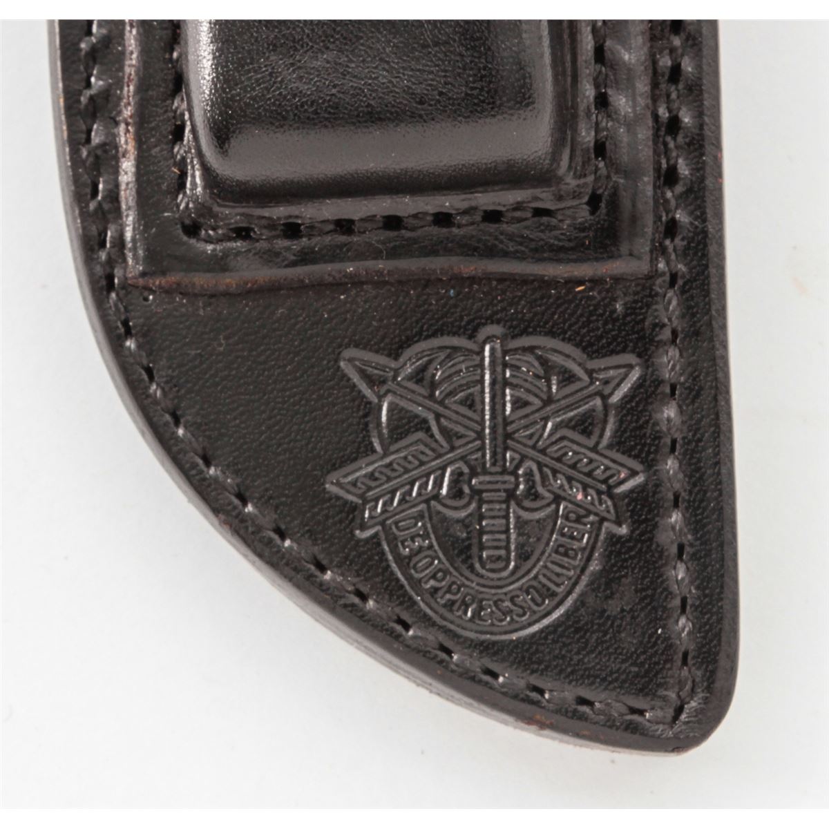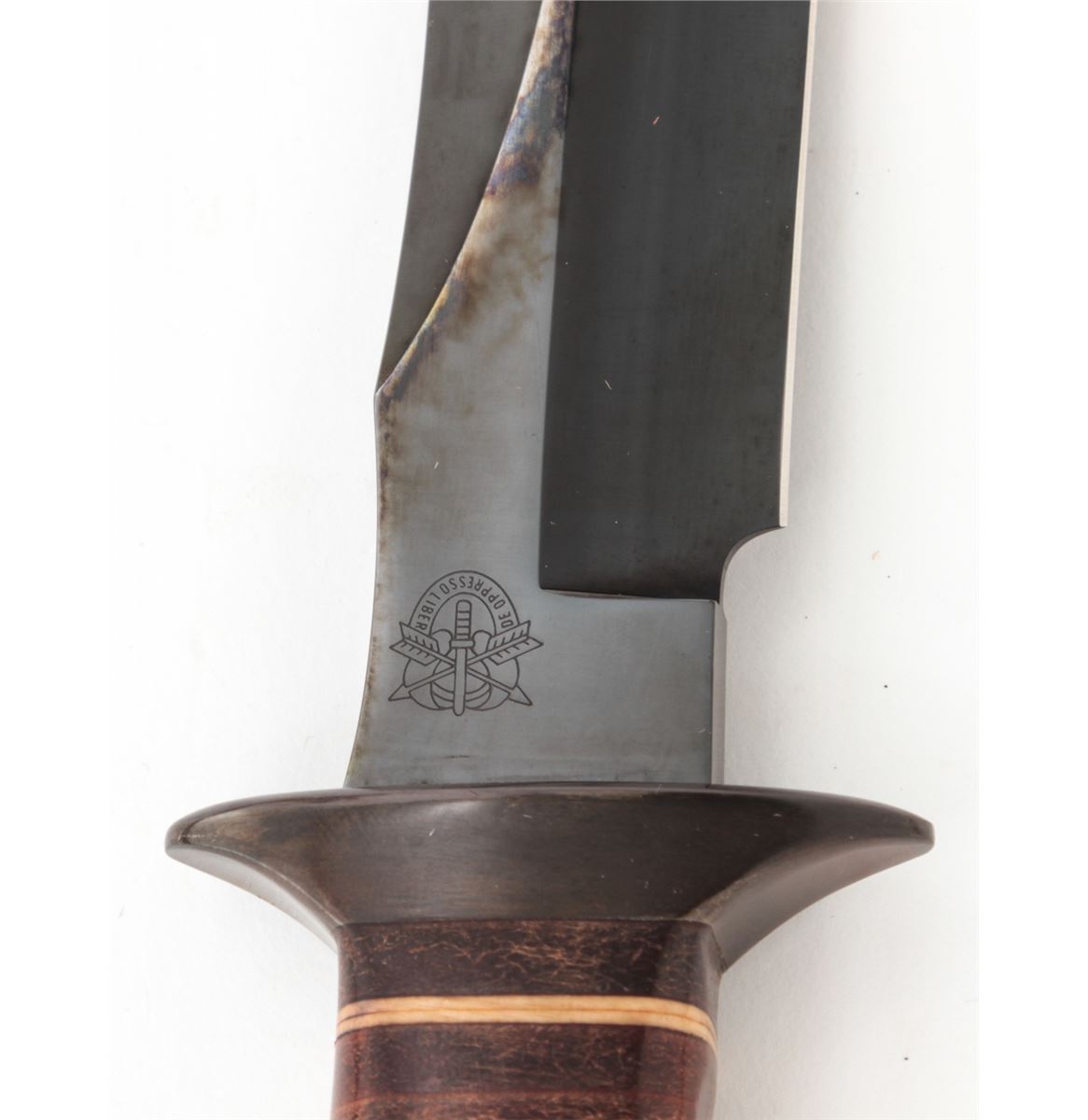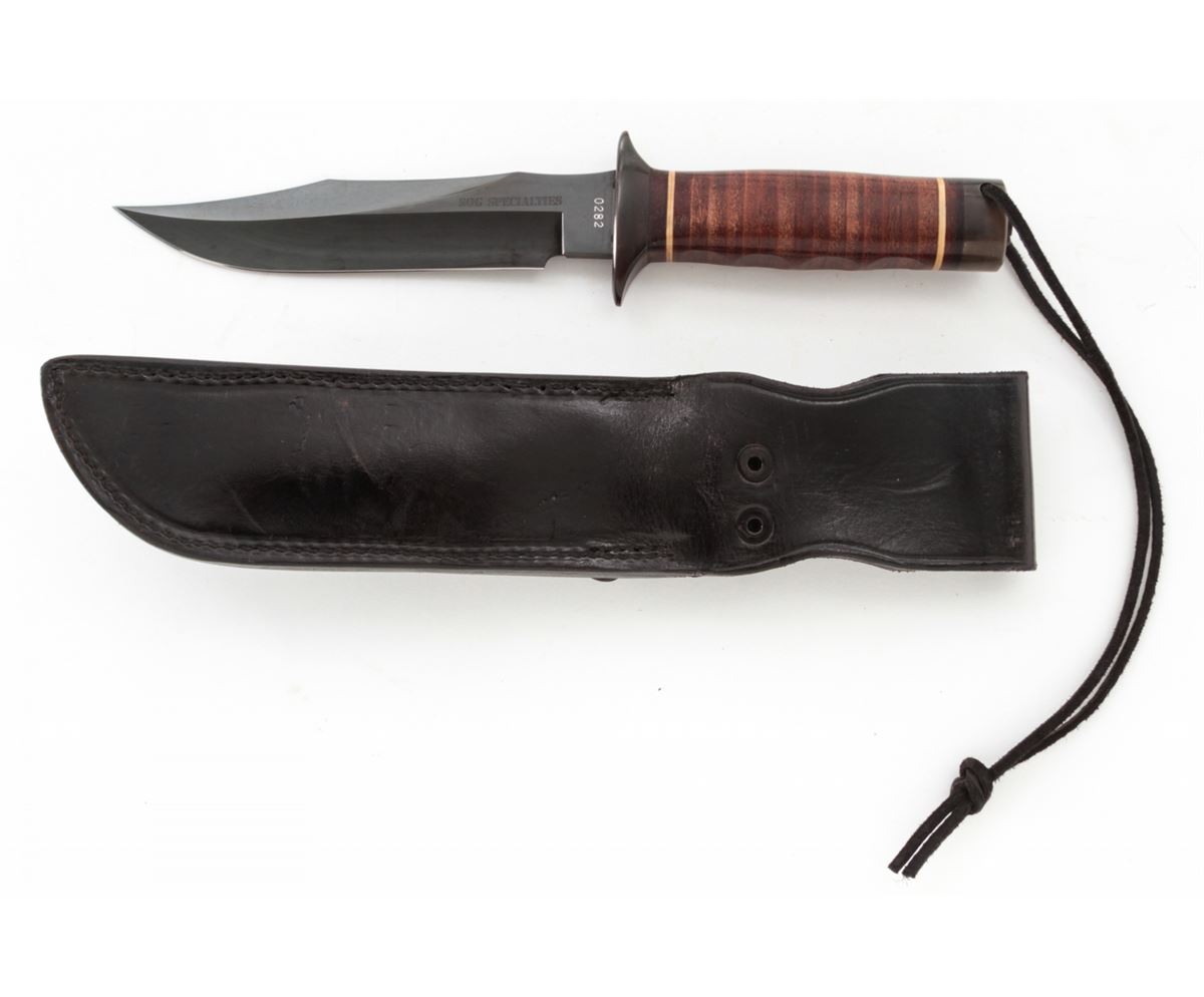 SOG Limited Edition Vietnam Special Forces Fighting Knife, 6-1/4'' dark blue/black blade marked ''SOG SPECIALTIES'' and serial number ''0282''; reverse marked ''VIETNAM/5TH SPECIAL FORCES GROUP''; ricasso marked with ''(De Oppresso Liber Special Forces Logo)''; 11'' overall length, stacked leather washer handle, leather bootlace style wrist thong, steel pommel marked ''JAPAN'', in black leather SOG sheath, with white sharpening stone, and wood display case with plaque on inside of lid that reads ''VIETNAM SPECIAL FORCES COMMEMORATIVE/MACV-SOG FIGHTER 1955-1975''. Condition is excellent showing no use. Blade retains approx. 98% blue with a few small patches of mild discoloration to one side of the blade due to prolonged contact with interior of wood case. Metal surfaces with micro-scratching and light marks from handling. Leather sheath with mild scuffs and impressions; sharpening stone with patches of pink staining. Case with glue residue present along the inside edges of lid. Est.: $400-$500.