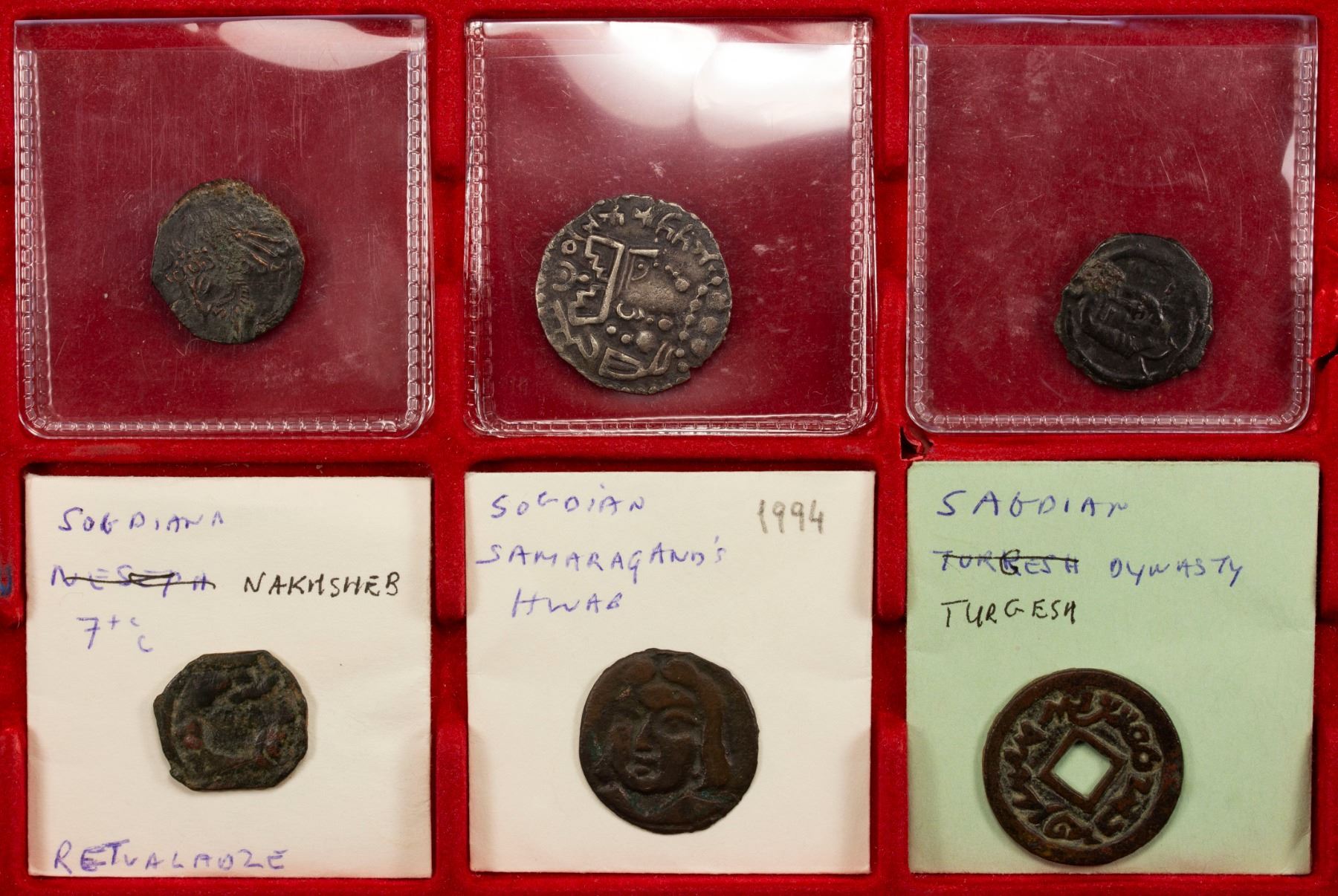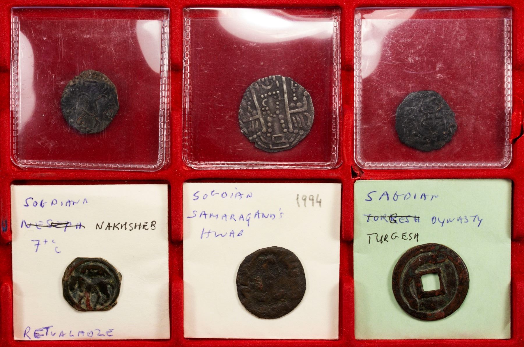 SOGDIANA: LOT of 1 silver and 5 copper coins, including Bukhara (early Bukharkhodat silver drachm), Chach (2 pcs, types S&K-1 and S&K-4.3), Nakhshab (cf. Zeno-326640), Samarqand HHwar, and Turgesh (standard type, bold VF); average circulated grades; retail value $400, lot of 6 pieces.