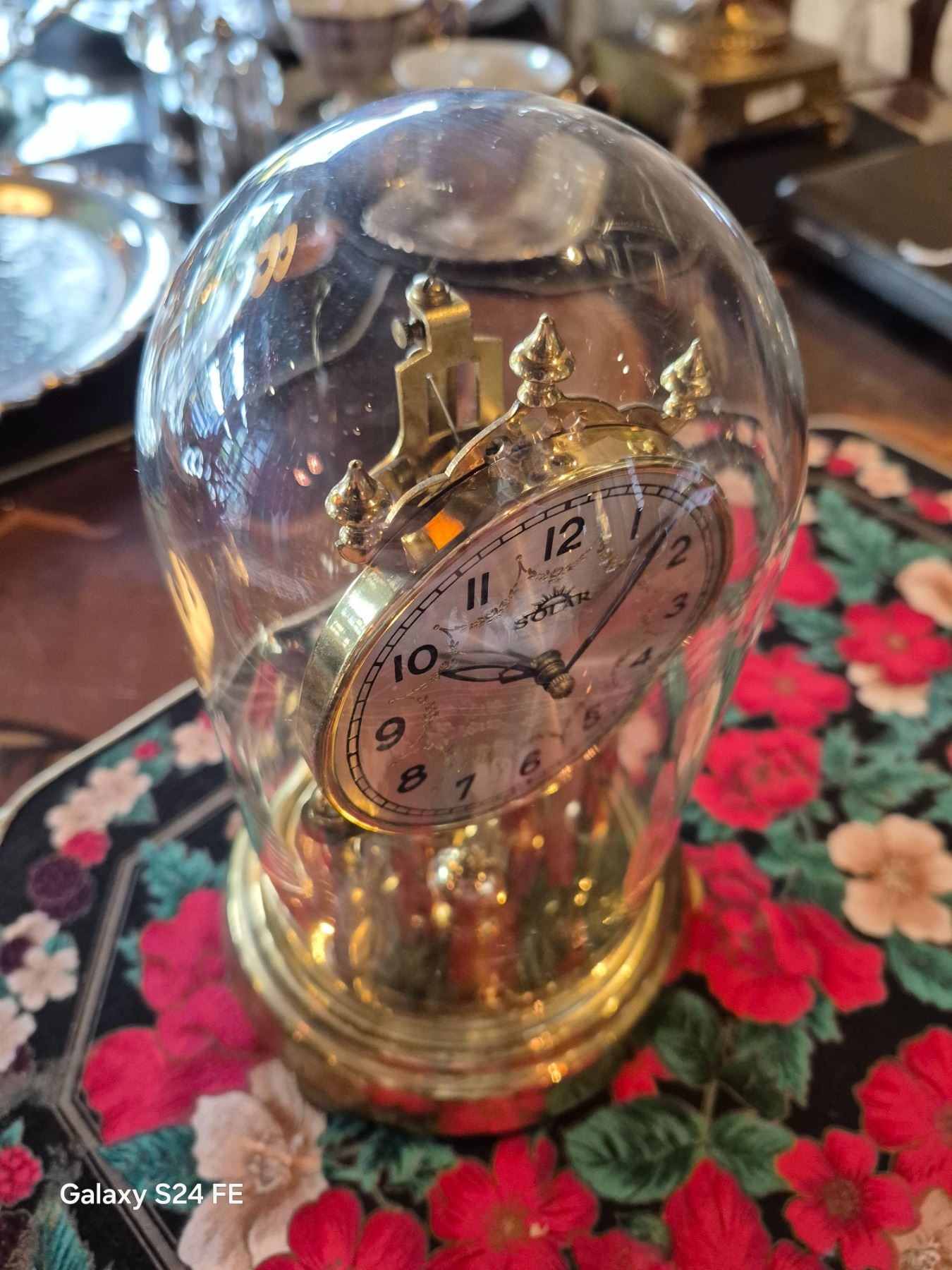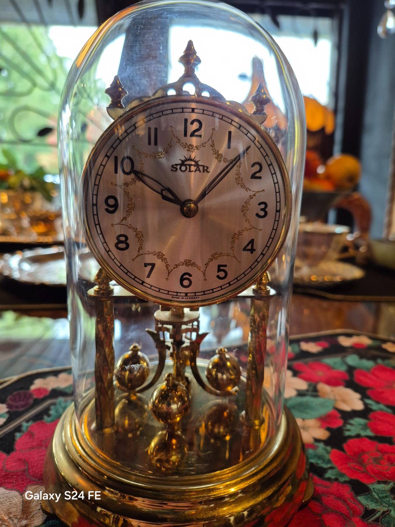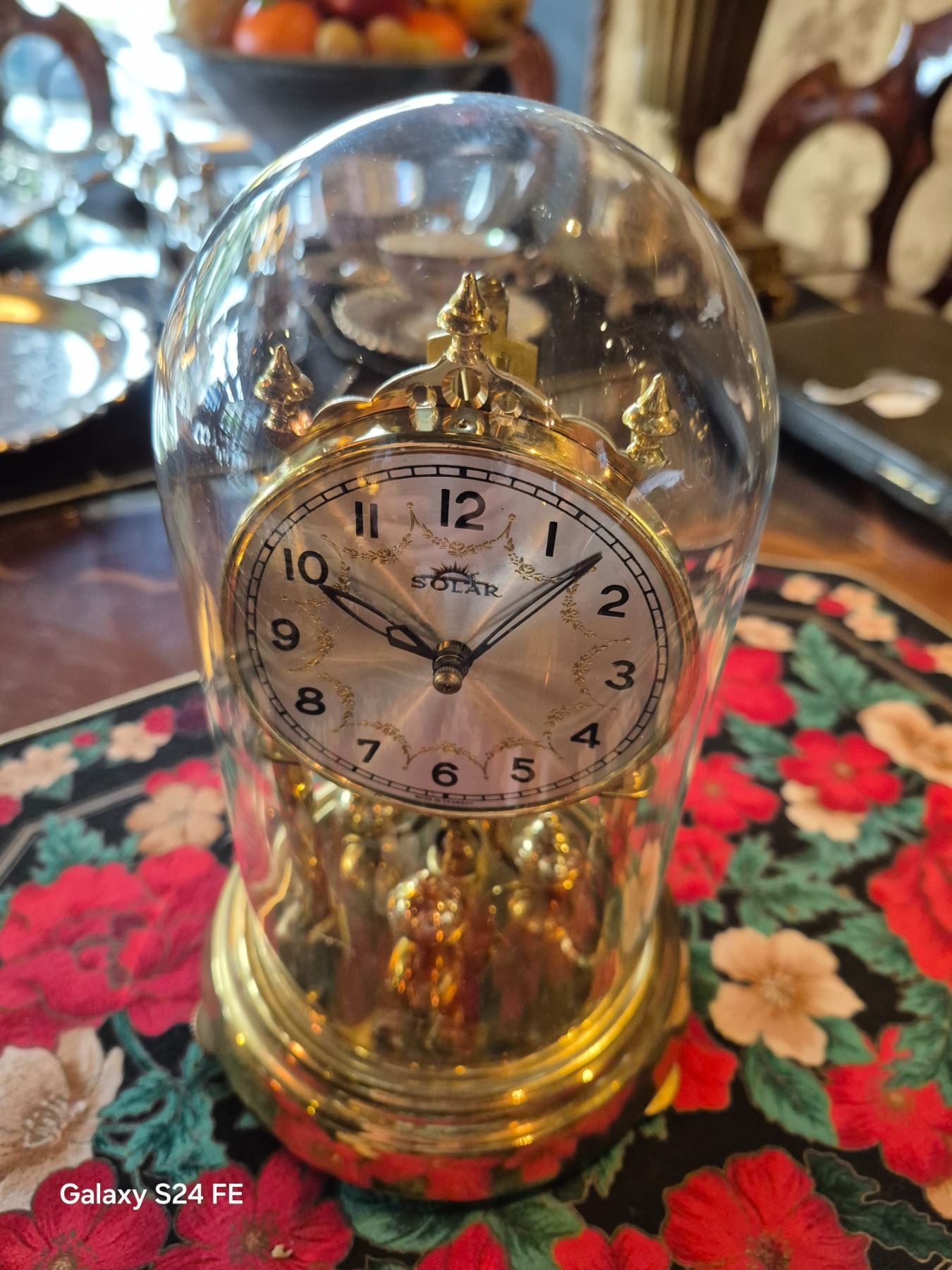 Vintage SOLAR anniversary-style clock with rotating pendulum, glass dome cover, elegant gold-tone detailing.
