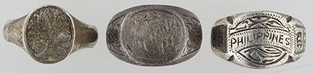 An interesting group of four items owned by a soldier likely engaged in combat in the Pacific, includes: three silver signet-style rings, the first stamped "Philippines 1945"; the second stamped "Manila P.I.", and the third bearing an insignia of a flower. Each ring is well-worn and of a small size (around an American size 7 1/2-8). Not marked for silver content but appear to be sterling. Together with a silver pocket knife with a scrolled design, a much older piece ca. early twentieth-century. Overall very good.