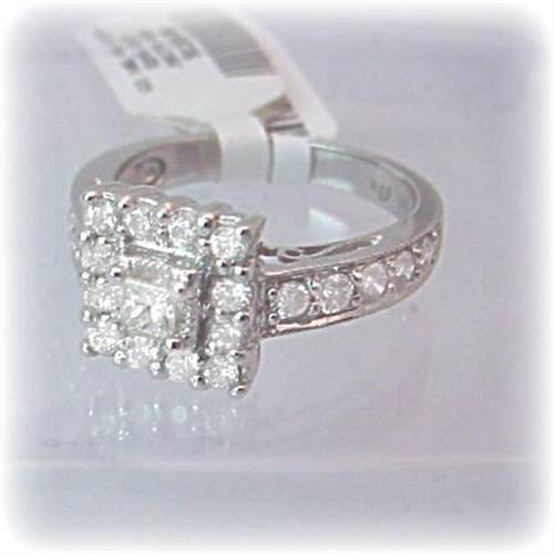 14 Karat White Gold sets these Princess and Round Cut Genuine Diamonds in this spectacular ring. Diamonds are I2-I3 and weigh 1CTW. <P>One large Princess Cut Diamond is surrounded by 12 Round Cut Diamonds. Plus there are four Diamonds set in each side, on the band, for extra sparkle and elegance. This ring would make a gorgeous Engagement or Anniversary ring. <p> <p> Our Gold Factory recently purchased the entire inventory from a Jewelry Firm that went out of business. We were able to purchase these items at a huge savings, which we now pass on to you! Most of these pieces are one of a kind. We have not factored in the increased price of Gold, so this is a double value! <p> Please note: our merchandise is guaranteed 100% to your satisfaction. If you DON'T LOVE this item, simply return it for a complete refund of your purchase price. Our feedback is 100% positive, so you can shop with confidence, knowing that your satisfaction is our primary concern. <p> * Insurance is included in our shipping charges.