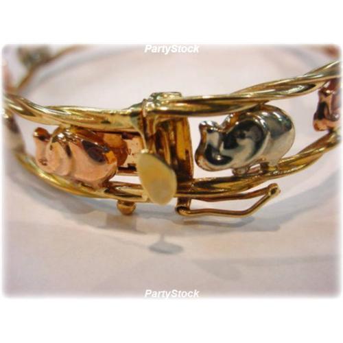 GLOSSY, 3 TONE, SOLID 14 KARAT YELLOW, WHITE AND ROSE GOLD BANGLE FEATURES ELEPHANTS! PERFECT FOR THE ELEPHANT COLLECTOR AND THESE HAVE THEIR TRUNKS UP FOR GOOD LUCK. <p> <P> Measures: 2.5 Inches in diameter (standard Bangle size)