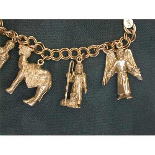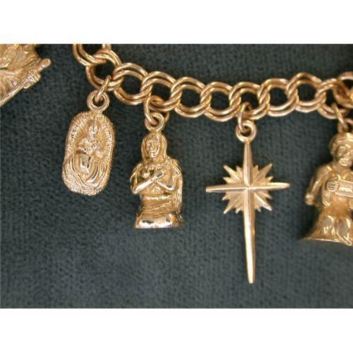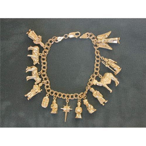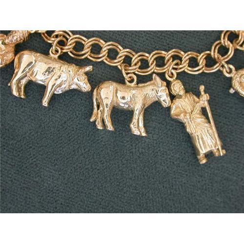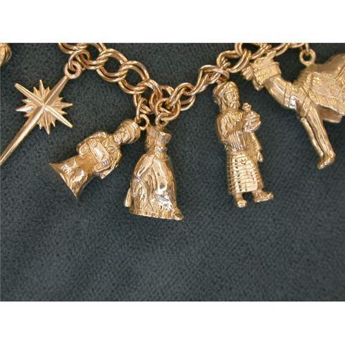 This 14k Yellow GOLD NATIVITY CHARM BRACELET features 13 Gold Charms related to the Christmas story! Among the gold charms there is a Gold Camel, Baby Jesus, Angel, Wisemen, Shepherd, and a Donkey! This 14K Solid Gold 'Christmas' Charm bracelet is 7 1/2" in length and it weighs Over 1 1/2 Ounces!! It is in Mint condition.