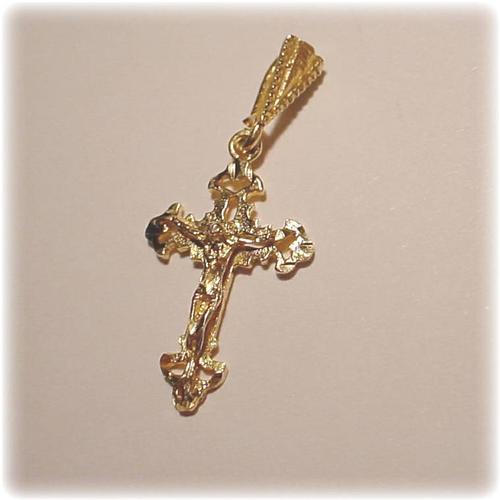 Solid 14K Yellow Gold forms this ornately detailed Crucifix charm/pendant. Filigree edges create a delicate look.