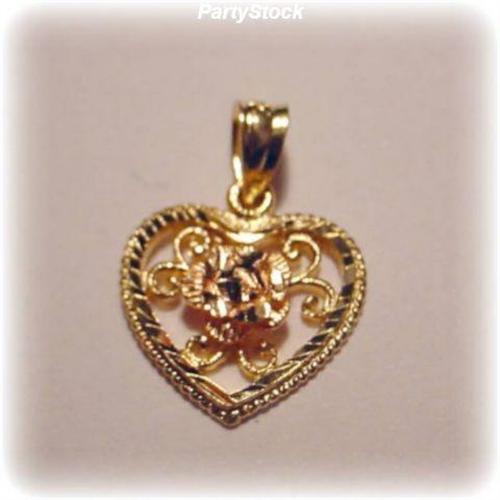 Solid 14K Gold (Yellow and Rose) forms this exquisite charm/pendant. Filigree scrolls create a delicate look.