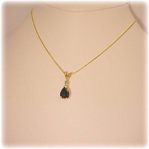14 Karat Yellow Gold Necklace with Pendant embellished with a small Genuine Emerald and a larger Genuine Blue Sapphire. Measures 3/4 Inch tall and is strung on a Solid 14 Karat Yellow Gold, 18 Inch Singapore chain. <p> <P> Measures: 18 Inches length. <p> Our Gold Factory recently purchased the entire inventory from a Jewelry Firm that went out of business. We were able to purchase these items at a huge savings, which we now pass on to you! Most of these pieces are one of a kind. We have not factored in the increased price of Gold, so this is a double value! <p> Please note: our merchandise is guaranteed 100% to your satisfaction. If you DON'T LOVE this item, simply return it for a complete refund of your purchase price. Our feedback is 100% positive, so you can shop with confidence, knowing that your satisfaction is our primary concern. <p> * Insurance is included in our shipping charges.
