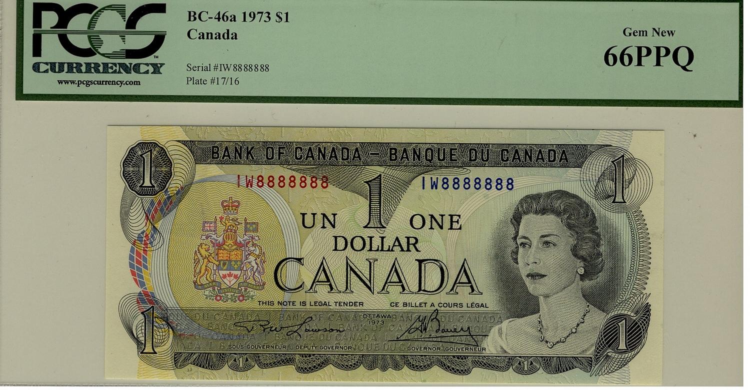 SOLID 1973 $1 BC-46a #IW8888888 PCGS Gem UNC66PPQ. A cool solid numbered note.