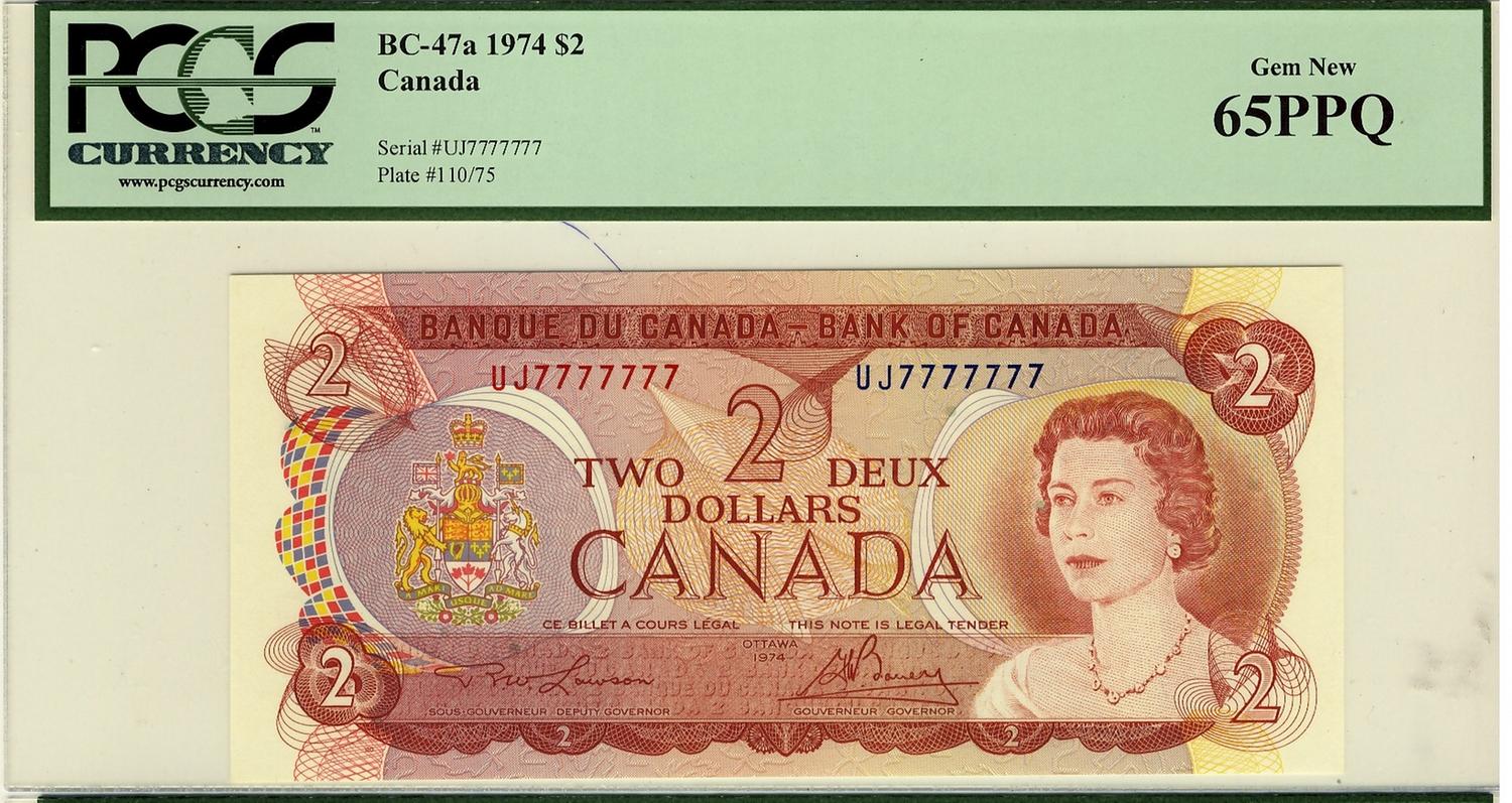 SOLID 1974 $2 BC-47a #UJ7777777 PCGS Gem UNC65PPQ.