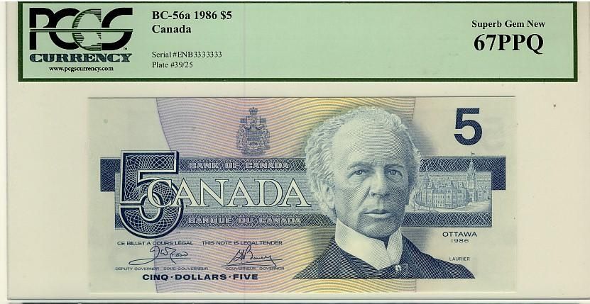 SOLID, 1986 $5 BC-56a ENB3333333 PCGS UNC67PPQ. A perfect example.