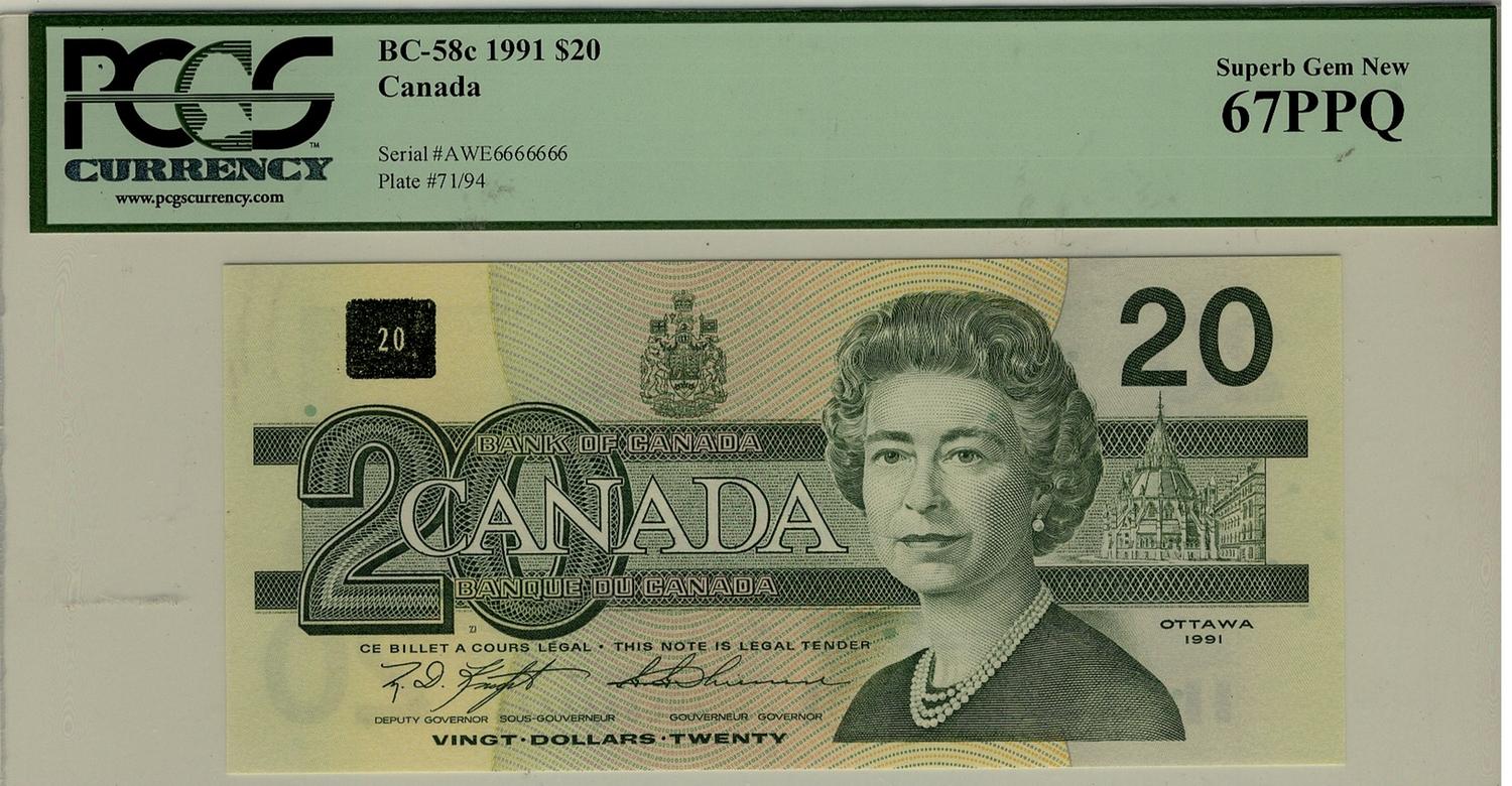 SOLID, 1991 $20 BC-58c #AWE6666666, PCGS Superb Gem UNC67 PPQ.