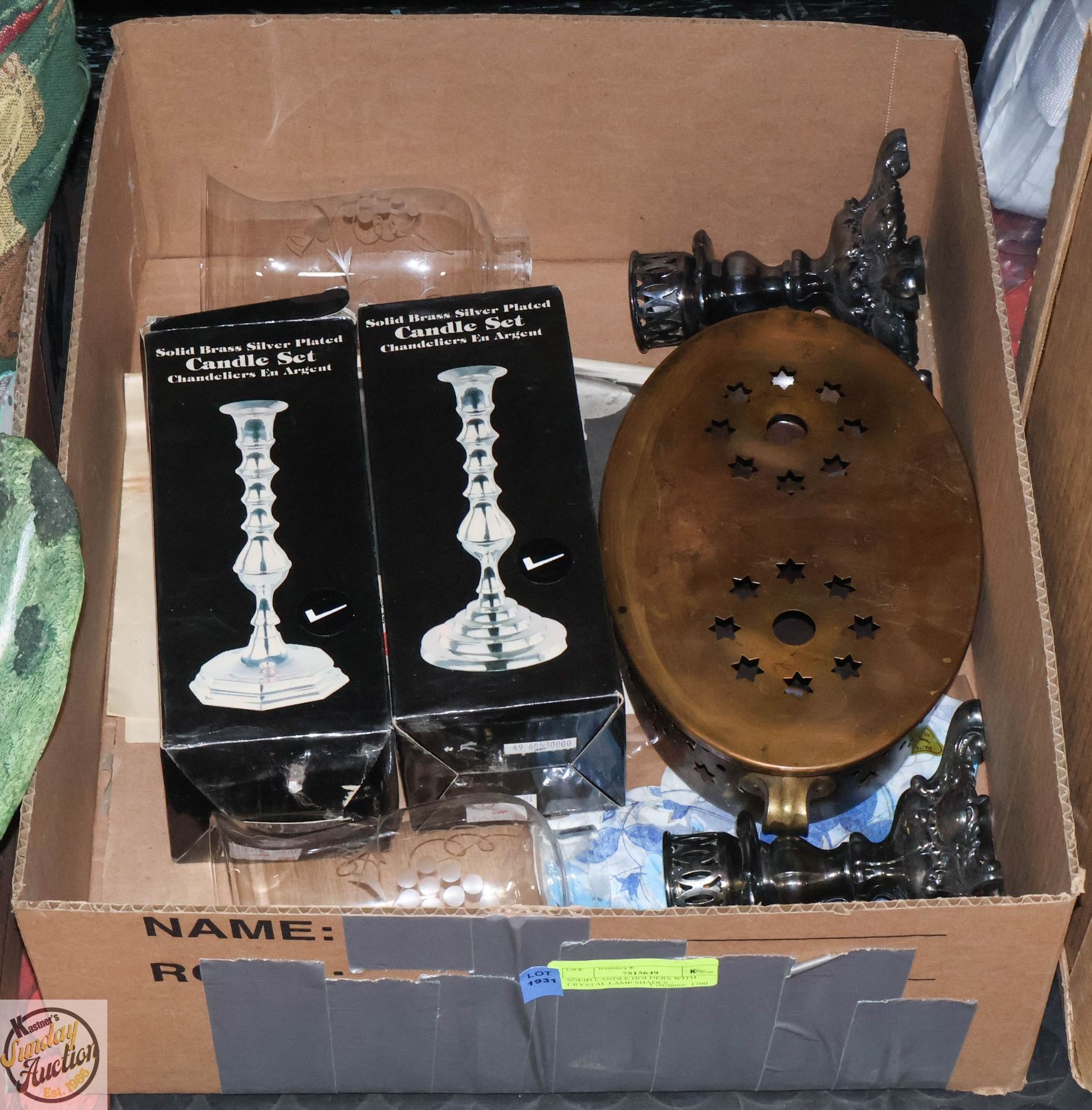 PAIR OF UNUSED SOLID BRASS SILVER PLATED CANDLE HOLDERS + COPPER/BRASS PORTABLE CANDLE LIT FOOD WARMER + NEW VINTAGE DECORATIVE PAPER NAPKIN **ALL PROCEEDS FROM THIS LOT WILL GO TO -IN THE WOODS ANIMAL RESCUE** **ALL ITEMS MUST BE REMOVED BY 5PM SATURDAY, JUNE 28th 2025. ALL REMAINING ITEMS WILL BE SUBJECT TO A $6.00 PER DAY STORAGE CHARGE. ANY ITEMS REMAINING AFTER MONDAY, JULY 14TH 2025 WILL BE CONSIDERED FORFEITED. NO REFUNDS WILL BE ISSUED FOR FORFEITED ITEMS. TO SCHEDULE A PICK UP APPOINTMENT CLICK HERE