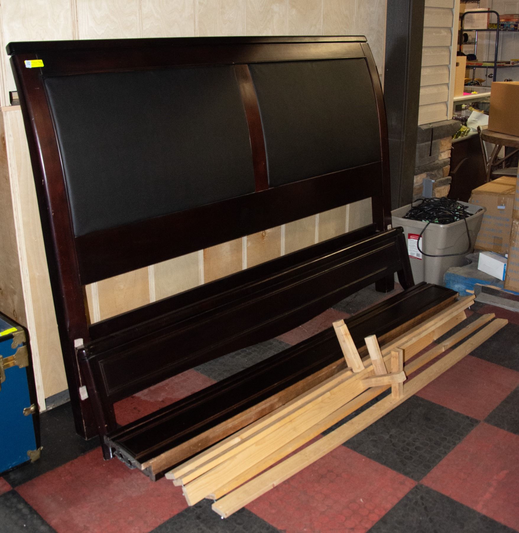 SOLID WOOD HEADBOARD WITH BLACK LEATHER PANELS, SOLID WOOD SIDE RAILS AND FOOT BOARD - HIGH QUALITY STURDY CONSTRUCTION, QUICK AND EASY ASSEMBLY, 5 STURDY CROSSRAILS (87"L X 82"W X 58"H)**ALL ITEMS MUST BE REMOVED BY 5PM MONDAY, OCTOBER 10TH, 2022. ALL REMAINING ITEMS WILL BE SUBJECT TO A $6.00 PER DAY STORAGE CHARGE. ANY ITEMS REMAINING AFTER MONDAY, OCTOBER 24TH, 2022 WILL BE CONSIDERED FORFEITED. NO REFUNDS WILL BE ISSUED FOR FORFEITED ITEMS. TO SCHEDULE A PICK UP APPOINTMENT CLICK HERE