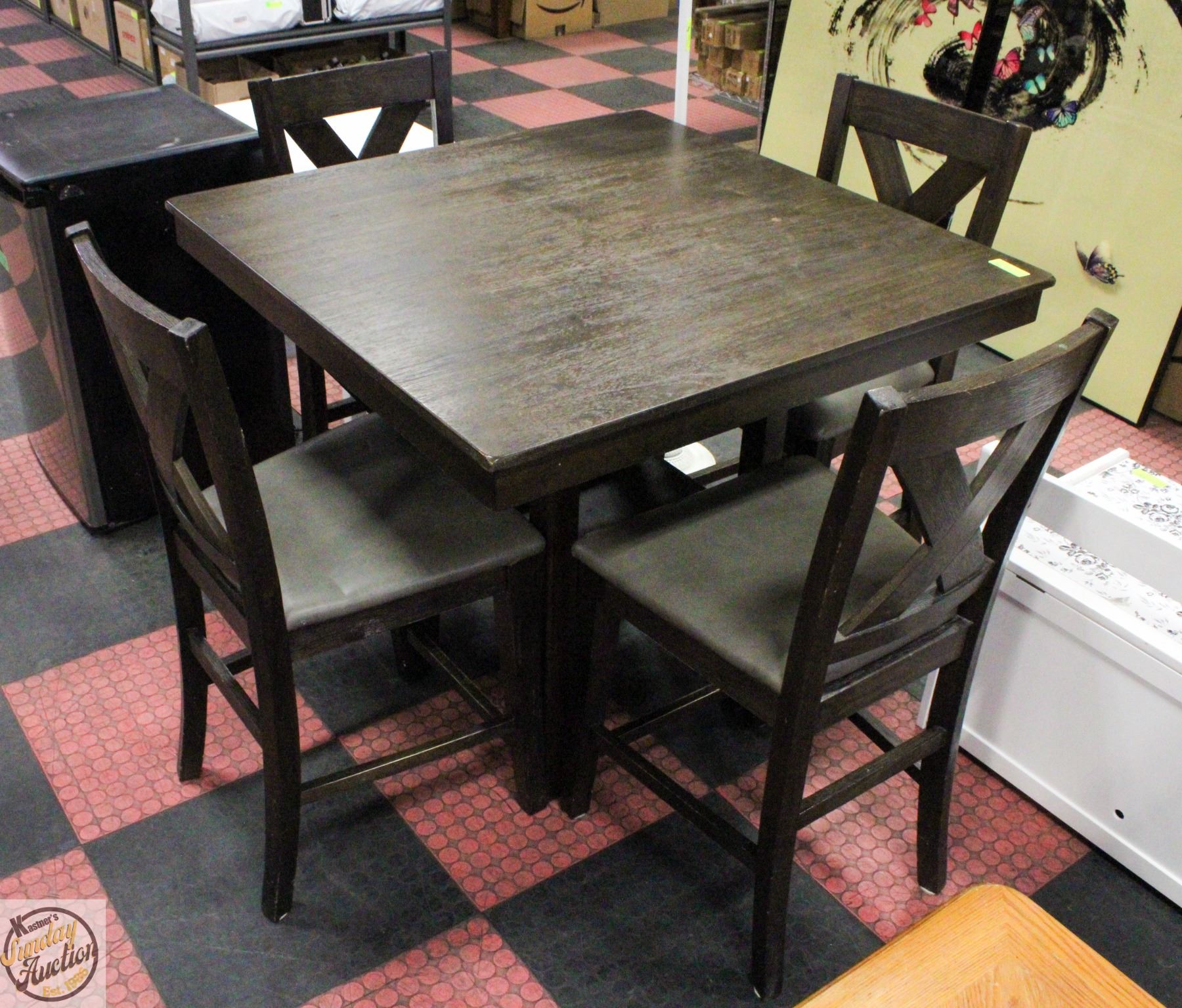 5-PIECE SET - COMES WITH 4 LEATHER PADDED SEATS - DARK WOOD HIGHBACK PUB-STYLE CHAIRS, ADJUSTABLE LEVELING FEET ON TABLE AND CONVENIENT BOTTOM SHELF (40"L X 40"W X 36"H) **ALL ITEMS MUST BE REMOVED BY 5PM SATURDAY, DECEMBER 6TH 2025. ALL REMAINING ITEMS WILL BE SUBJECT TO A $6.00 PER DAY STORAGE CHARGE. ANY ITEMS REMAINING AFTER MONDAY, DECEMBER 22ND 2025 WILL BE CONSIDERED FORFEITED. NO REFUNDS WILL BE ISSUED FOR FORFEITED ITEMS. TO SCHEDULE A PICK UP APPOINTMENT CLICK HERE