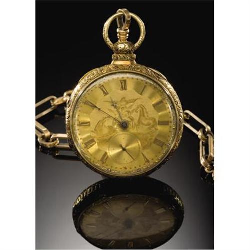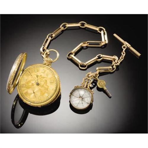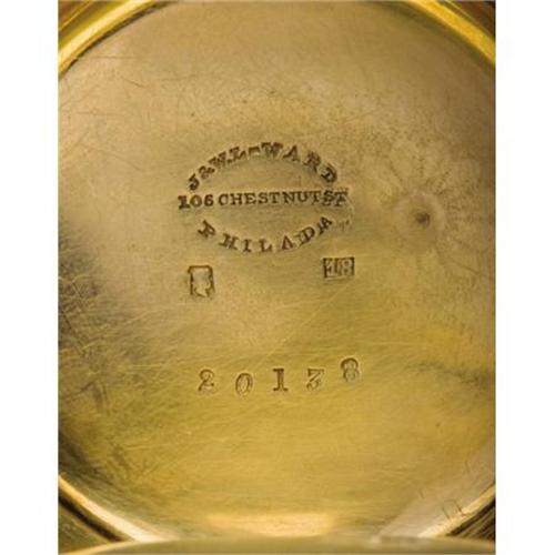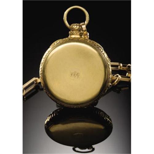<B>SOLID GOLD POCKET WATCH - CAPTAIN CALVIN S. HARTLEY OF 28TH</B></I> <B> PA VOLUNTEERS - PENNSYLVANIA ENGRAVING , ca 1865</B></I> This highly ornate pocket watch and chain belonged to Capt. Calvin S. Hartley of Pennsylvania. Capt. Hartley served under Colonel John S. Geary of the 28th Pa. Volunteers, who fought at the Battle of Gettysburg. The watch is very unique as the face is finely engraved with the Pennsylvania State seal. The reverse interior is touch marked by the retailer, “J & W. L. Ward, 106 Chestnut Street, Philada. - 18(karat)”. The National Watch and Clock Collector's Museum, and the Pennsylvania State Museum have researched and noted this watch; it is the only example known to have this state engraving. The chain is also thick and engraved, the fob is an unusual gold compass and the key remains. The reverse has small initial engraving. This is a fine historic Civil War and Pennsylvania watch.<BR><BR><b>Shipping:</b> Miscellaneous Collectibles, Smal (<a target="_blank" href="http://www.heritageauctions.com/common/shipping.php">view shipping information</a>)