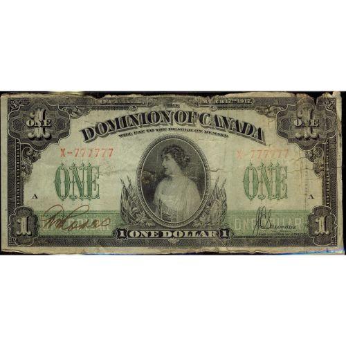SOLID NUMBERED Dominion note DC-23b 1917 $1 X-777777 Saunders, the note grades VG to Fine with some rough edges. First one seen by the cataloguer. RARE! Expect strong bidding