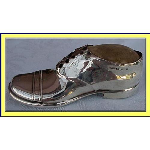 Sterling Silver Pin cushion in the form of a man's shoe. Made Chester, England, 1909.