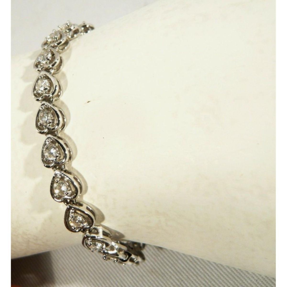 SOLID STERLING Silver HEARTS & Crystal Tennis BRACELET. This Bracelet would be prefect for a Gift For A Loved One. The Bracelet measures approximately 7 inches in length and has a weight of 12.4 grams. This Well Made Bracelet has a Double Safety Catch. The Bracelet comes with a Very Nice presentation BOX as shown in the pictures. The piece has 25 Hearts centered with 25 Crystals and is marked "925" for Solid Sterling Silver. View Photos For Further Details