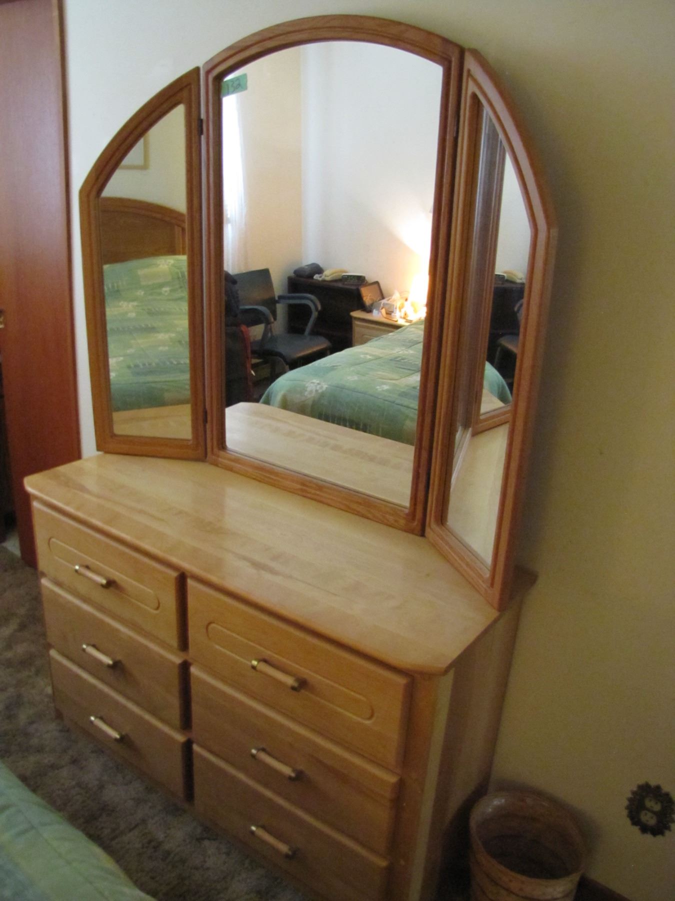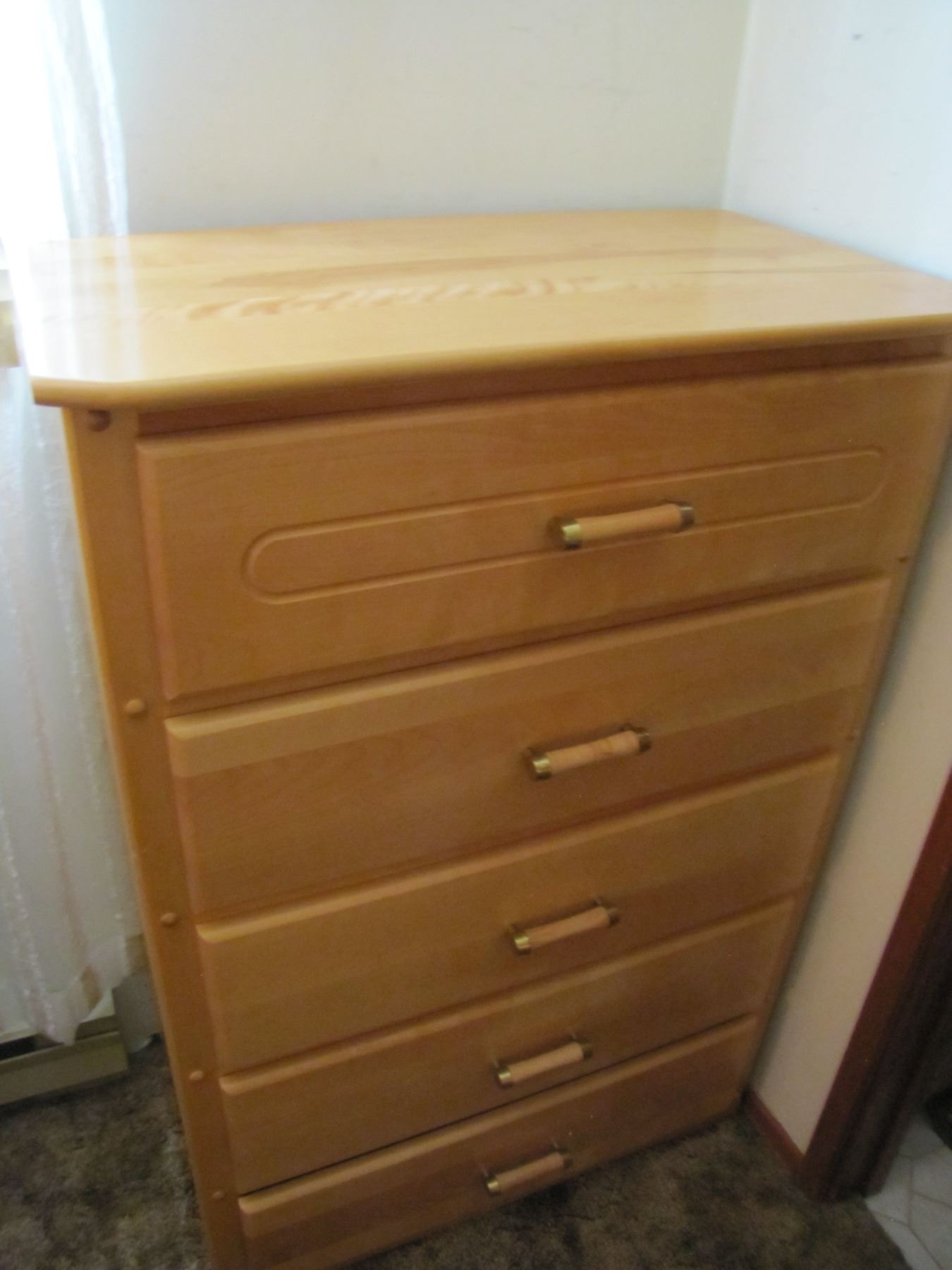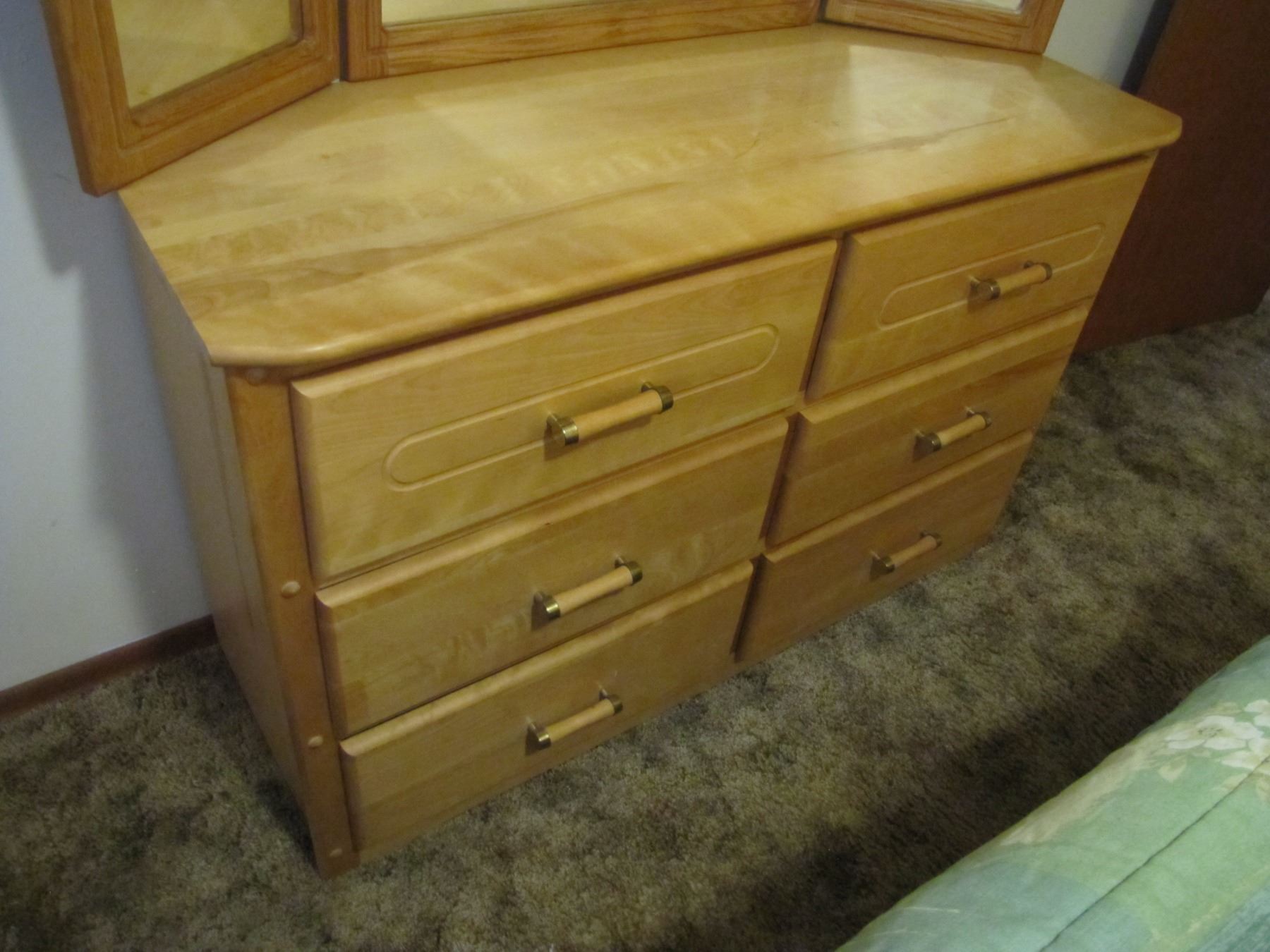SOLID WOOD 5 piece bedroom suite includes two bedside end tables , headboard, Dresser with mirror, and high boy dresser NOTE; BED NOT INCLUDED