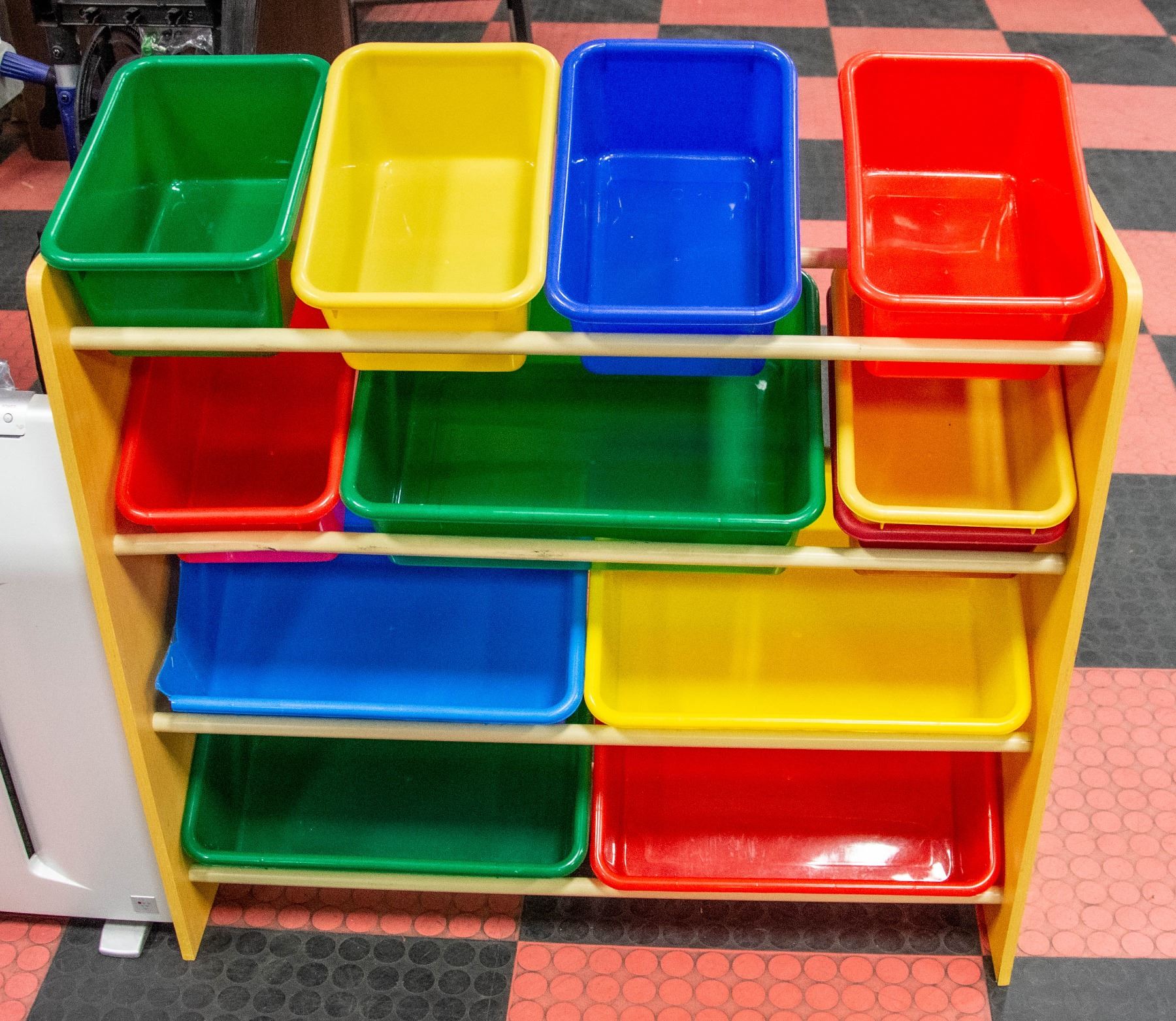 CRAFTS/TOYS/TOOL BENCH - 12 MULTI-COLOUR SORTING BINS (34.5"L X 10.5"W X 31"H)