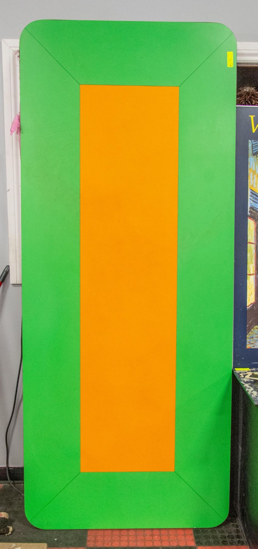 BANQUET/MULTI-PURPOSE TABLE (90"L X 37.5"W X 30.5"H), YELLOW AND GREEN WITH STURDY FOLD-OPEN METAL LEGS