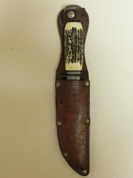 HERE IS A SOLINGEN MADE MOUNTAIN SURVIVAL KNIFE-ANTLER GRIP-MADE" PIC SOLINGEN GERMANY. NICE 5" FIXED BLADE KNIFE & LEATHER SHEATH-CLEAN BLADE-SOME SCRATCHED ON BOTTOM-ONE SIDE-ORIGINAL CROSSGRAIN THROUGHOUT-RICASSO MARKED "PIC-SOLINGEN GERMANY" REVERSE LOGO PIC AXE IN MOUNTAINSIDE-WHAT APPEARS TO BE A HORN OR ANTLER GRIP-LEATHER RIVETED SHEATH-COUPLE OF BLADE DINGS IN SHEATH-TOTAL LENGTH IN SHEATH-10"