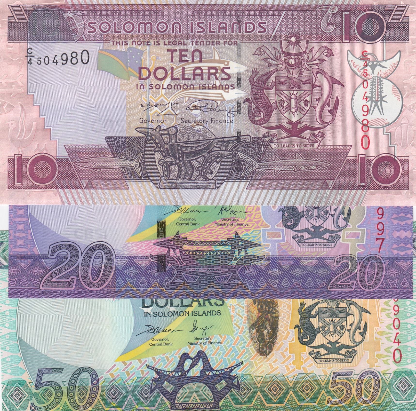 Solomon Islands, 10 Dollars, 20 Dollars and 50 Dollars, 2006/ 2006/ 2004, UNC, p27/ p28/ p29, ( Total 3 Banknotes)