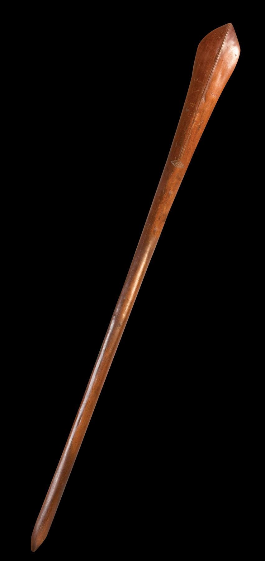 (Early-20th Century) Hardwood with leaf-shaped head and raised medial ridge. Pre-WWII. 48"x4". VG+ with typical wear.