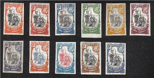 SOMALI COAST 1902-3 IMPER SET VF-NG --SOMALI WARRIORS TALL TYPE GROUP OF 11 IMPERF COLOR TRIAL