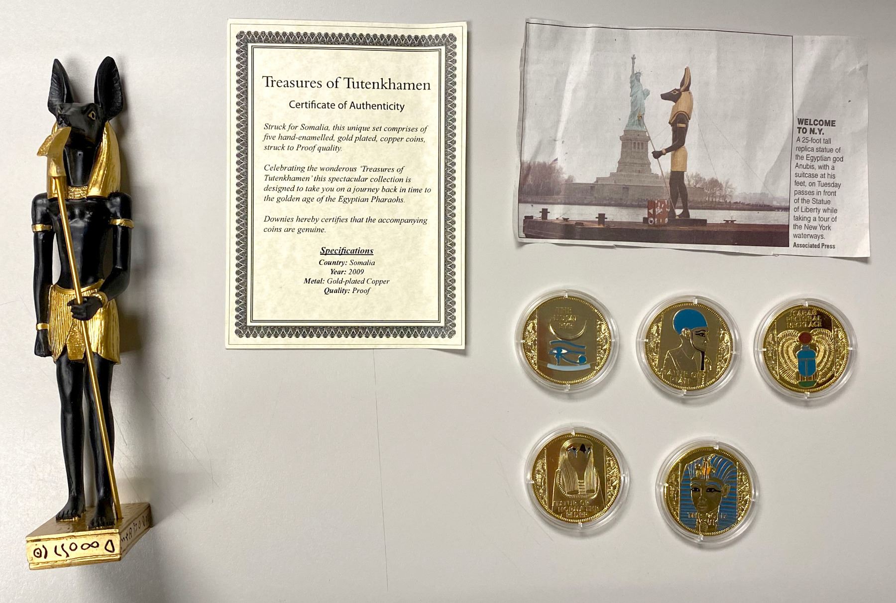 SOMALIA: Republic, 5-coin set, 2009, The Treasures of Tutankhamun Series of 250 shilling coins including: The Udjat Eye, Tutankhamun Funeral Mask, Statue of Ptah, Statue of Horus the Elder, and Scarab Pectoral Necklace, all struck in gilt colorized copper-nickel proof quality, with small statue of Anubis included in the large sarcophagus shaped box, with COA of issue, a scarce and difficult to find set, set of 5 coins, S.
