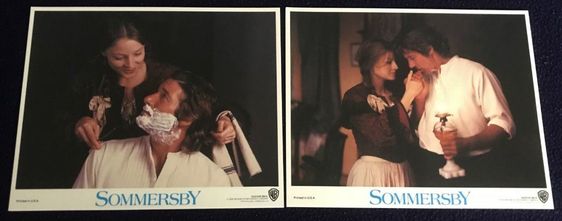 Full set of original 1993 lobby cards (8) 10x8 inches. Sommersby is a 1993 American romantic period drama film directed by Jon Amiel from a screenplay written by Nicholas Meyer and Sarah Kernochan. The film stars Richard Gere and Jodie Foster in the lead roles. Bill Pullman, James Earl Jones, Clarice Taylor, Frankie Faison, and R. Lee Ermey are featured in supporting roles. Set in the Reconstruction period following the U.S. Civil War, the story is adapted from the historical account of 16th century French peasant Martin Guerre. In the film; John (Gere) is presumed dead after he fails to return from the Civil War. His wife, Laurel (Foster), is set to marry her neighbour, Orin Mecham (Pullman), but he mysteriously returns after six years.