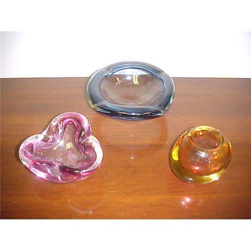 3 PC. LOT SOMERSO GLASS ITEMS 6 1/2 IN BLUE BOWL 41/2 IN PINK BOWL, 4 IN. YELLOW ORANGE VASE