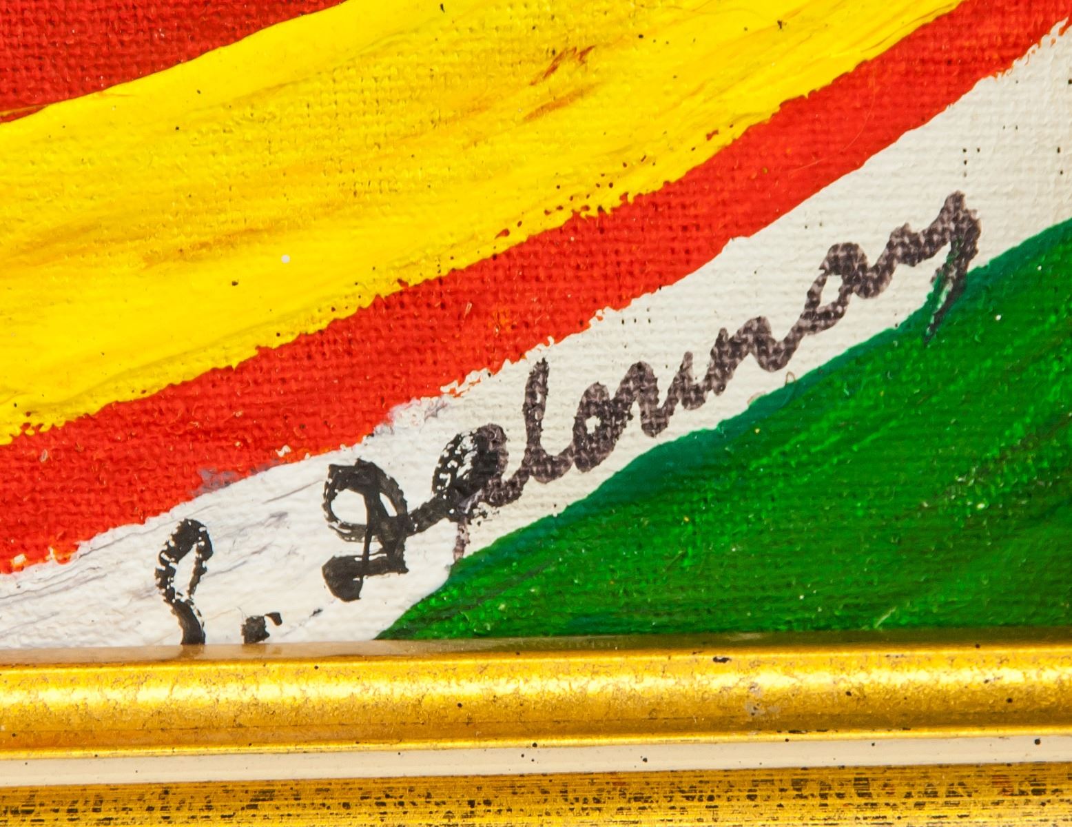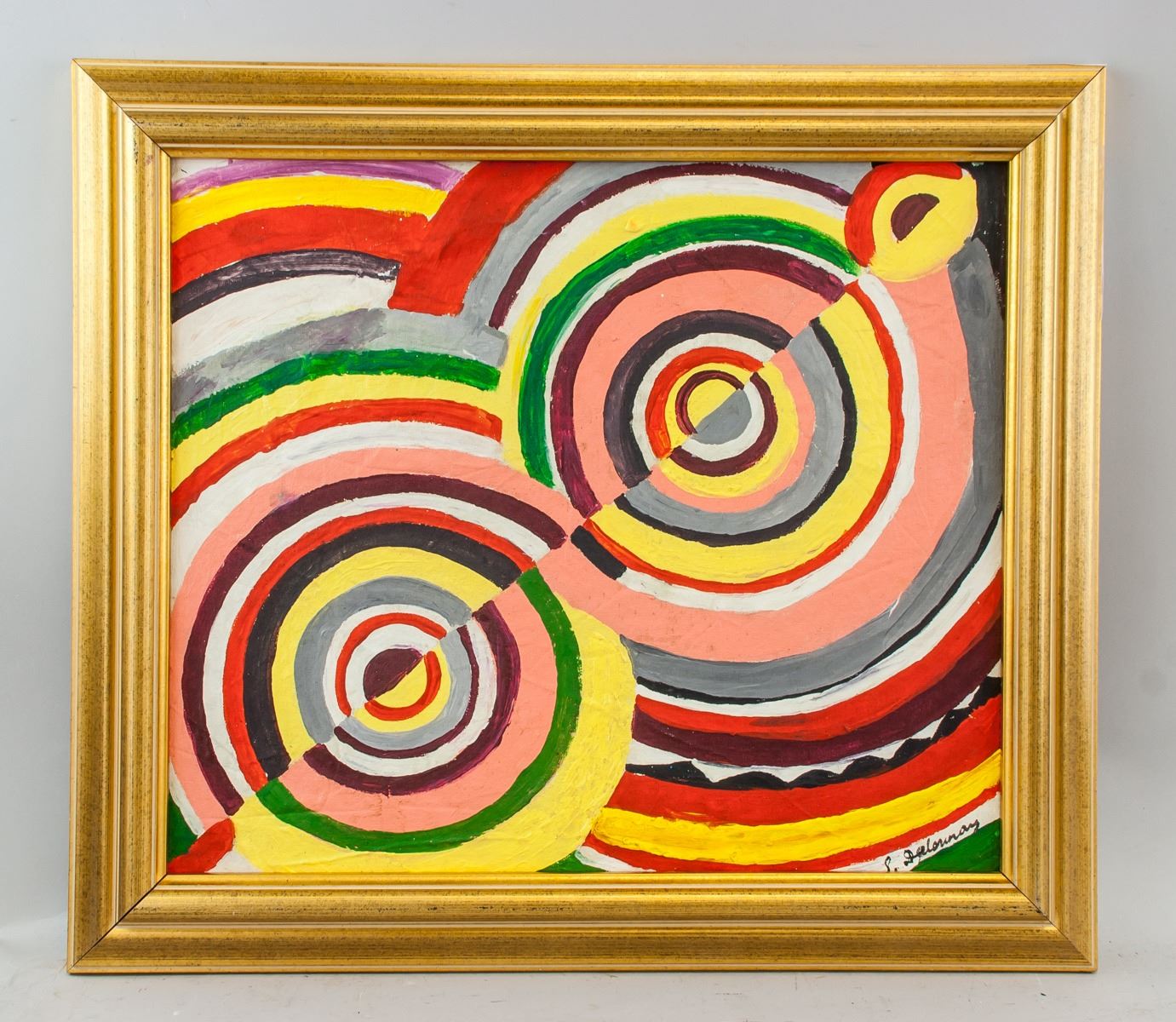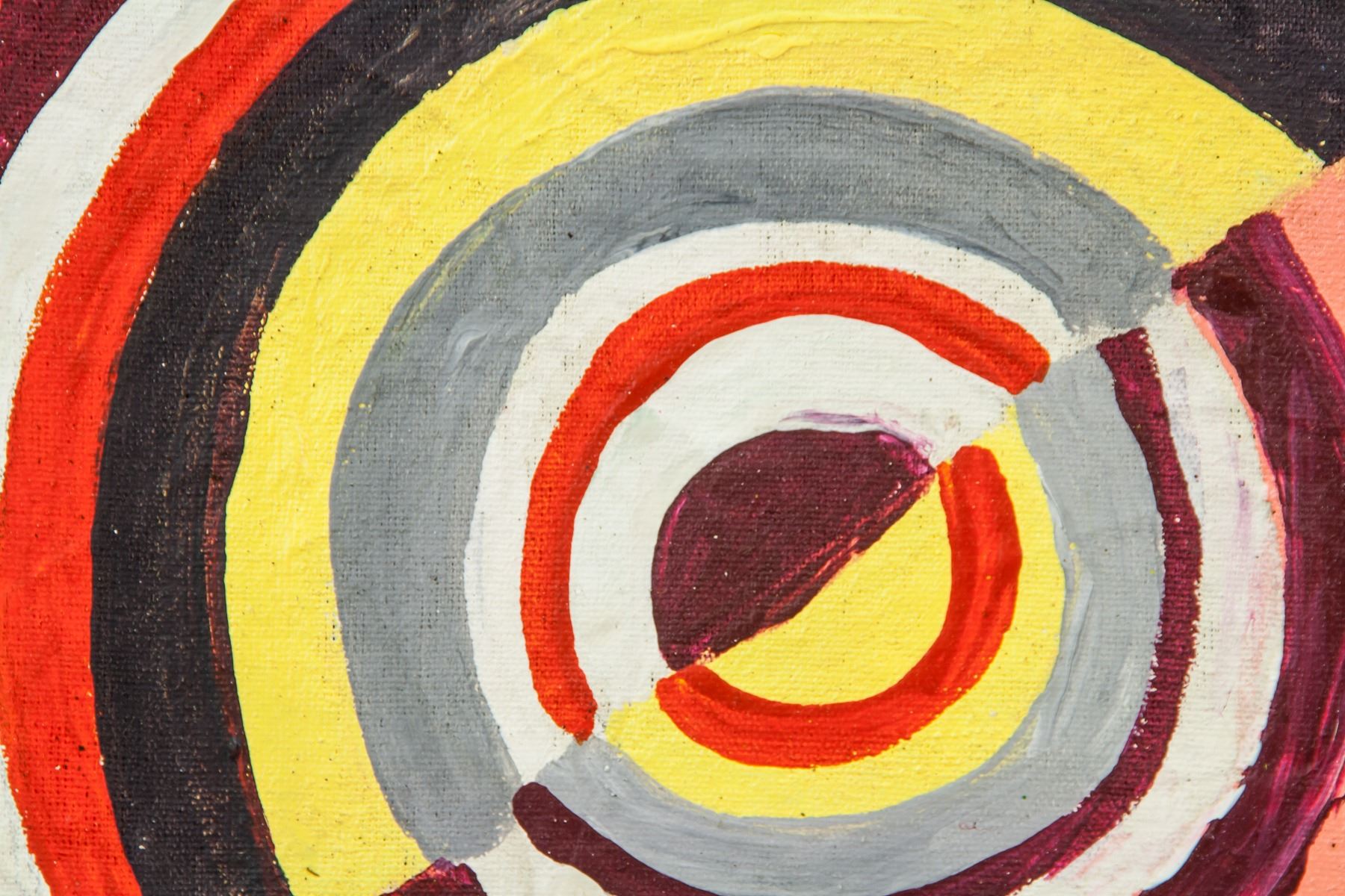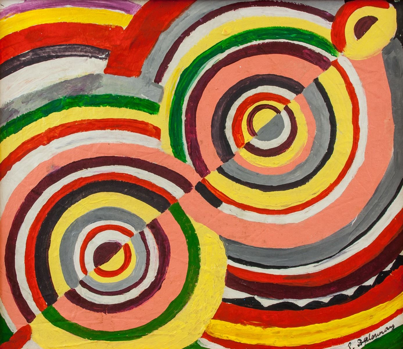 Oil on canvas, framed. Featuring an abstract expressionist composition of concentric circles in vibrant colors. Signed and attr. Sonia Delaunay (Ukrainian-French, 1885-1979) on the lower right corner. 39 x 46 cm (15.4 x 18.1 inches), frame: 51 x 58 cm (20.1 x 22.8 inches). Sonia Delaunay was a multi-disciplinary abstract artist and key figure in the Parisian avant-garde. Alongside her husband, Robert Delaunay, she pioneered the movement Simultanism. Her exploration of the interaction between colours has created a sense of depth and movement throughout her oeuvre. Sonia Delaunay spanned the full arc of the adventure of abstraction in Europe across the first half of the 20th century. One of the early pioneers, she helped to bring art and life together in the period between the First and Second World Wars and continued to champion the cause of abstraction as a universal visual language in the post-war era. As she wrote in her autobiography: We Will Go Right Up to the Sun (Nous irons jusq’au soleil) in 1978, one year before she passed away: ‘What had people been saying about me up to then? - muse of Orphism, decorator, Robert Delaunay’s partner. Then they conceded: "collaborator, continuer…" before admitting that the work existed in its own right." As well as a major retrospective at the Kunstmuseum Bielefeld in 1958, Delaunay was the first living female artist to have a retrospective exhibition at the Louvre in 1964. She has also had her work shown at Musee d’Art Moderne in Paris, Smithsonian Cooper-Hewitt, National Design Museum, Musee des Arts Decoratifs, Musee National d’Art Moderne and Tate Modern. PROVENANCE: Southern Ontario estate