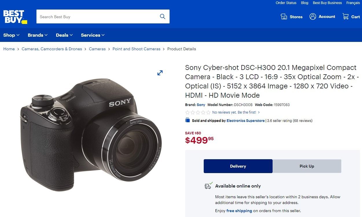 35X OPTICAL ZOOM. TAKES AA BATTERIES(NOT INCLUDED). CAMERA ONLY, NO CABLES, ACCESSORIES OR BOX ETC. $499.95 BEST BUY **ALL ITEMS MUST BE REMOVED BY 5PM SATURDAY, JULY 15TH 2023. ALL REMAINING ITEMS WILL BE SUBJECT TO A $6.00 PER DAY STORAGE CHARGE. ANY ITEMS REMAINING AFTER MONDAY, JULY 31ST, 2023 WILL BE CONSIDERED FORFEITED. NO REFUNDS WILL BE ISSUED FOR FORFEITED ITEMS. TO SCHEDULE A PICK UP APPOINTMENT CLICK HERE