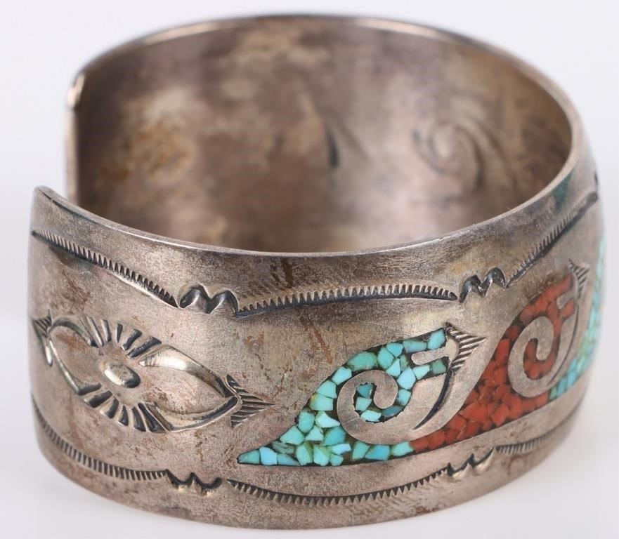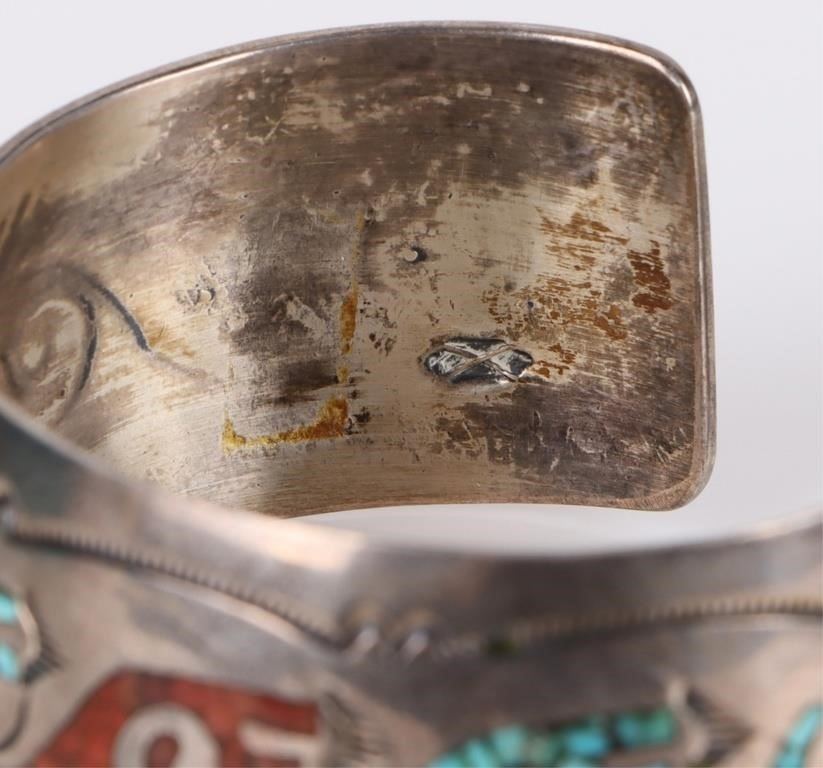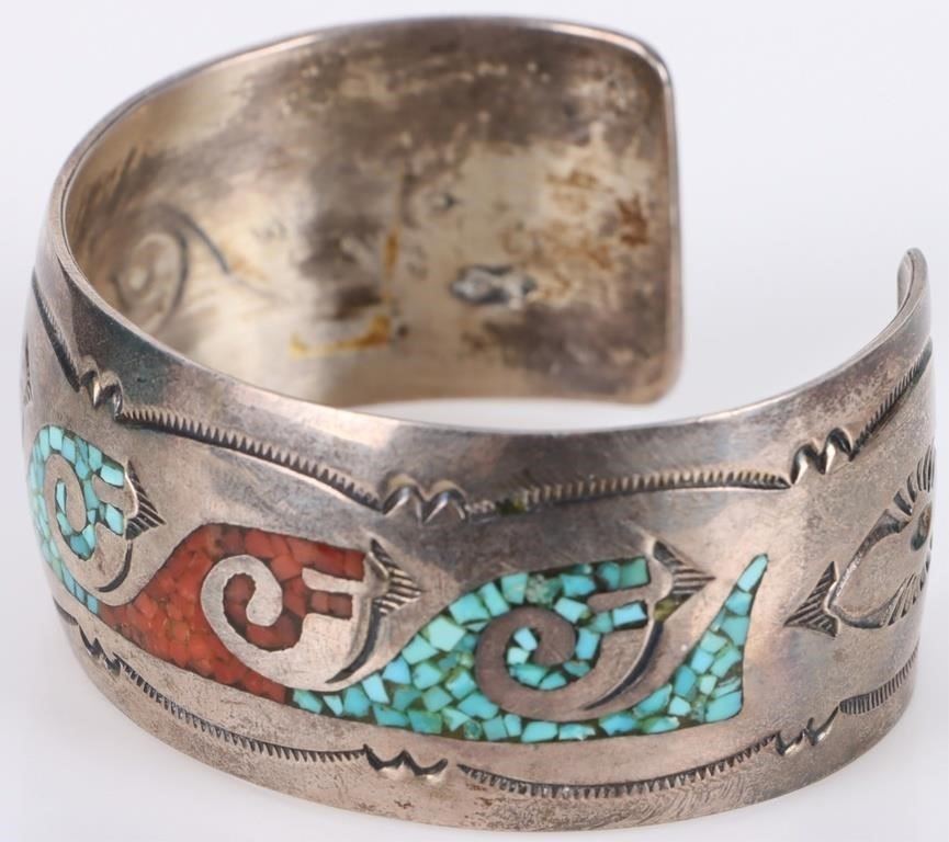 Southwest Navajo sterling silver Mosaic turquoise and coral ladies cuff bracelet.