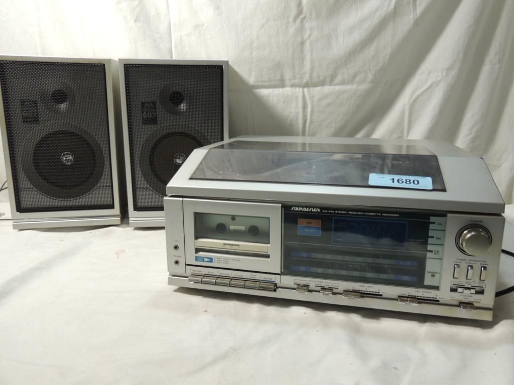 STERO SOUNDESIGN AM/FM RECEIVER CASSETTE PLAYER. RECORDER. SPEAKERS. 3 PIECE STEREO. AS SHOWN. SEE PHOTO FOR MORE DETAILS.