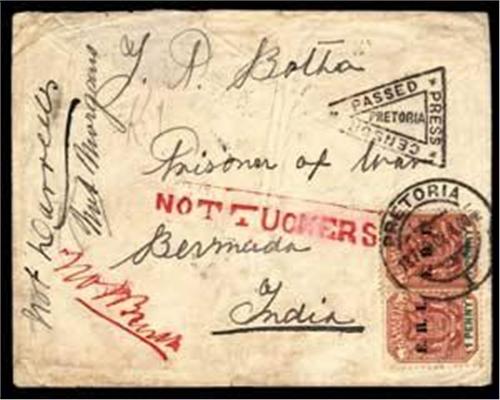 Boer War: 1902 censored env from Pretoria franked by 2x 1901 1d red and green (SG 239) tied to cover by Pretoria cds for FE.13.1902, apparently mistakenly addressed to a POW in Bermuda, India, and sent Bermuda, West Indies, where a s/l h/s in red 'NOT TUC