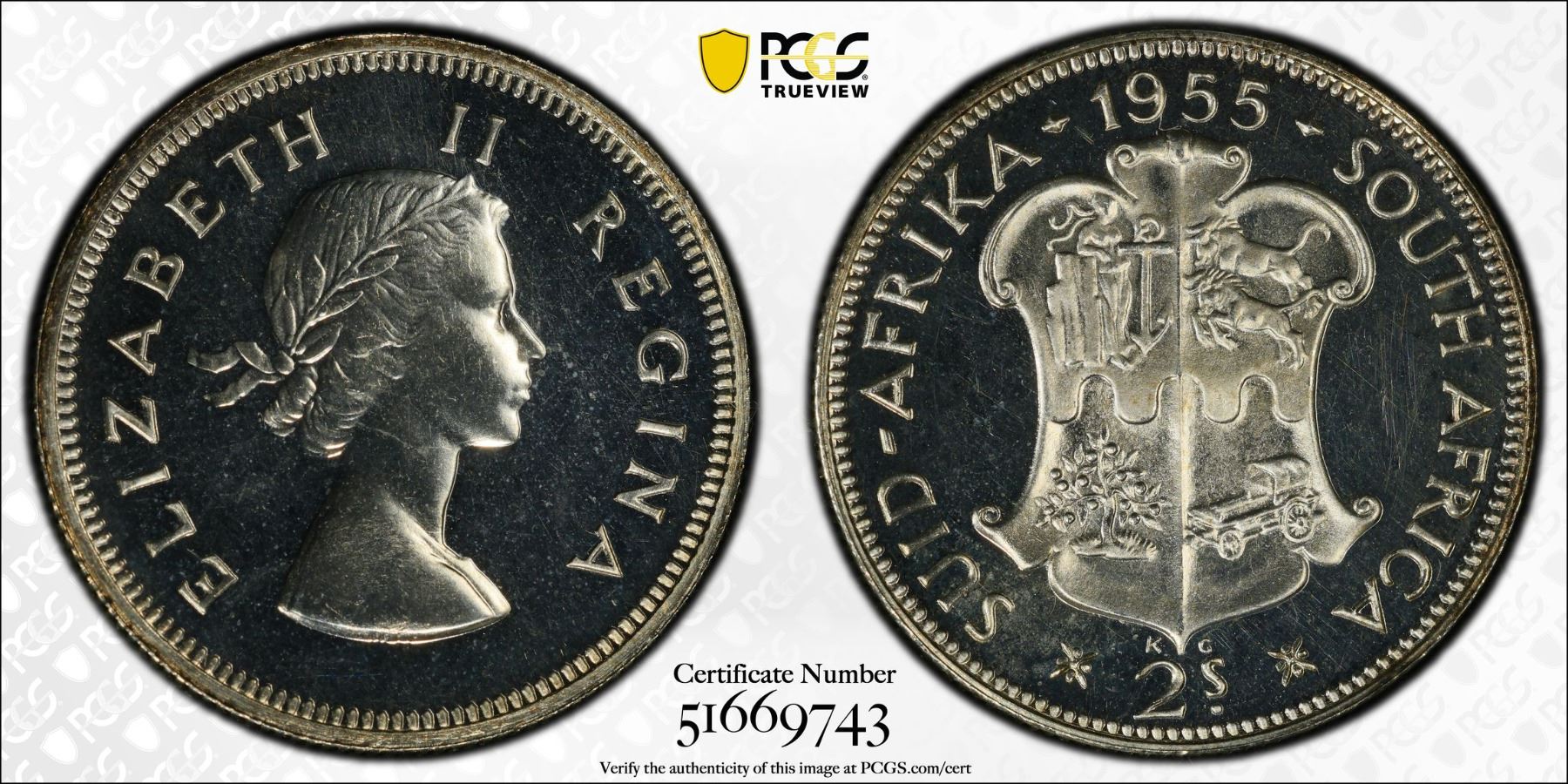 SOUTH AFRICA: Elizabeth II, 1952-1961, AR 2 shillings, 1955, PCGS Proof 65