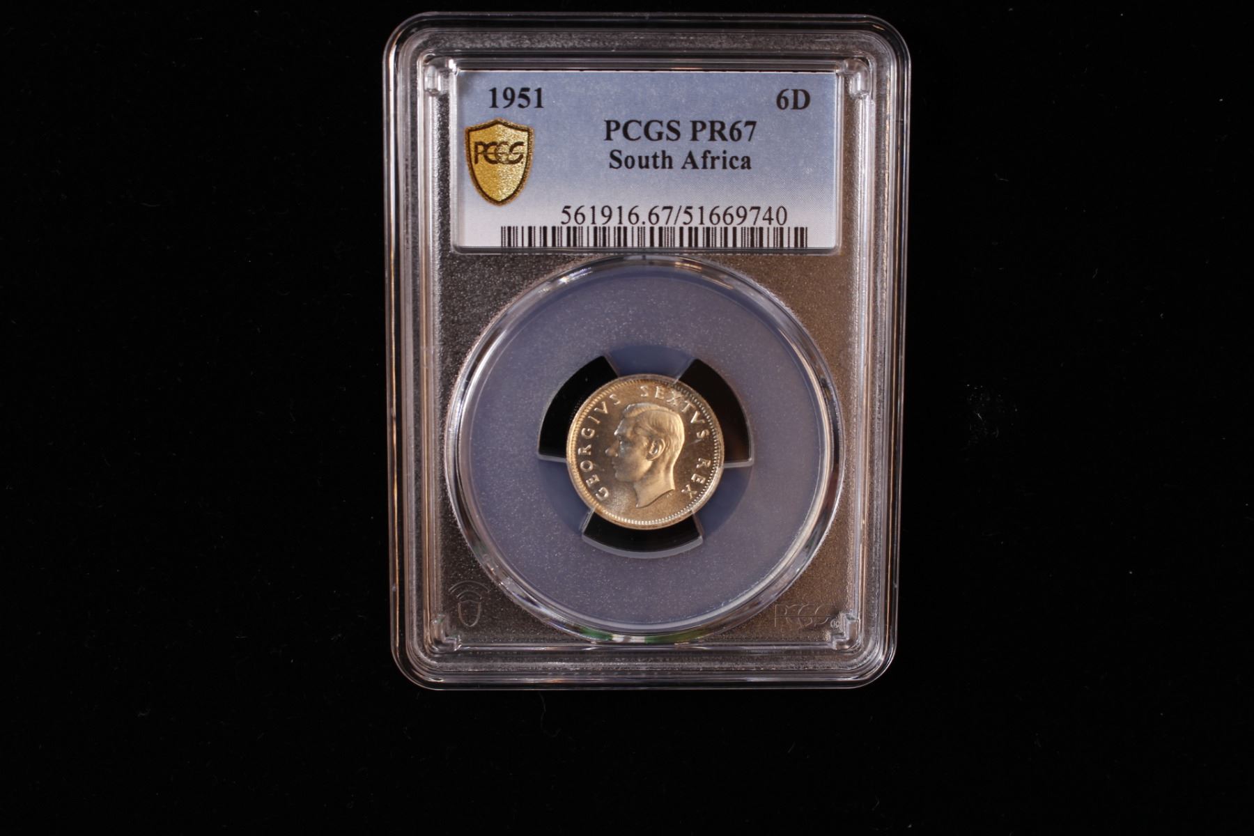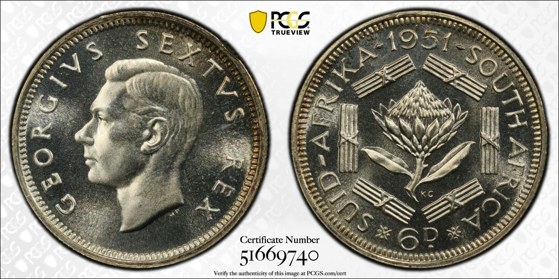 SOUTH AFRICA: George VI, 1936-1952, AR 6 pence, 1951, KM-36.2, a stunning proof quality example! PCGS graded Proof 67.