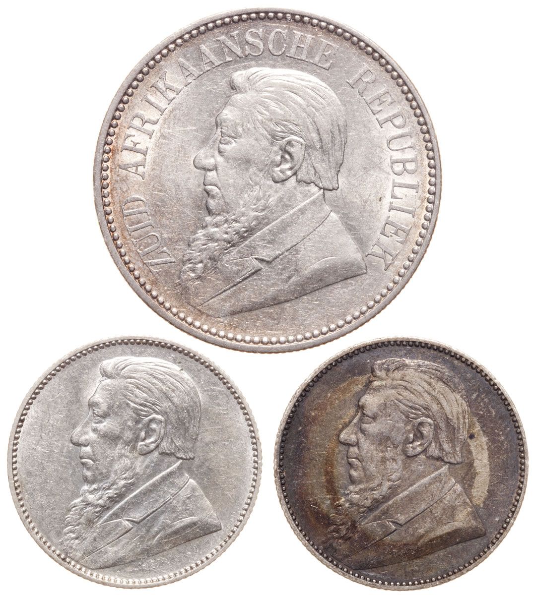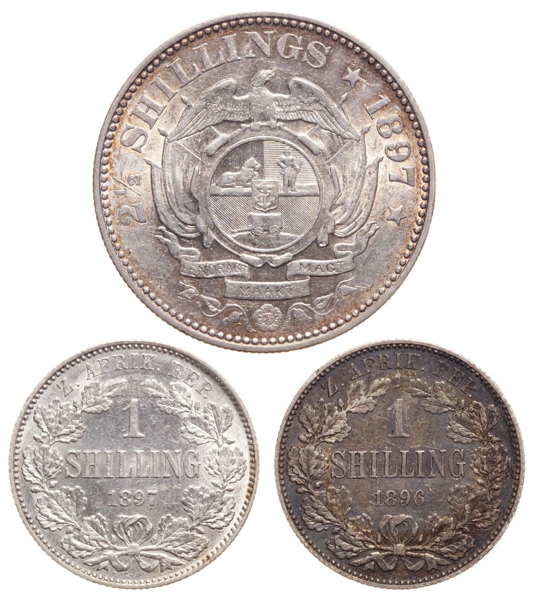1896-1897. 5 & 7. ZAR half crown 1897, shillings x 2 1896 & 1897. Extremely Fine to Unc. Lot of three (3) pcs.