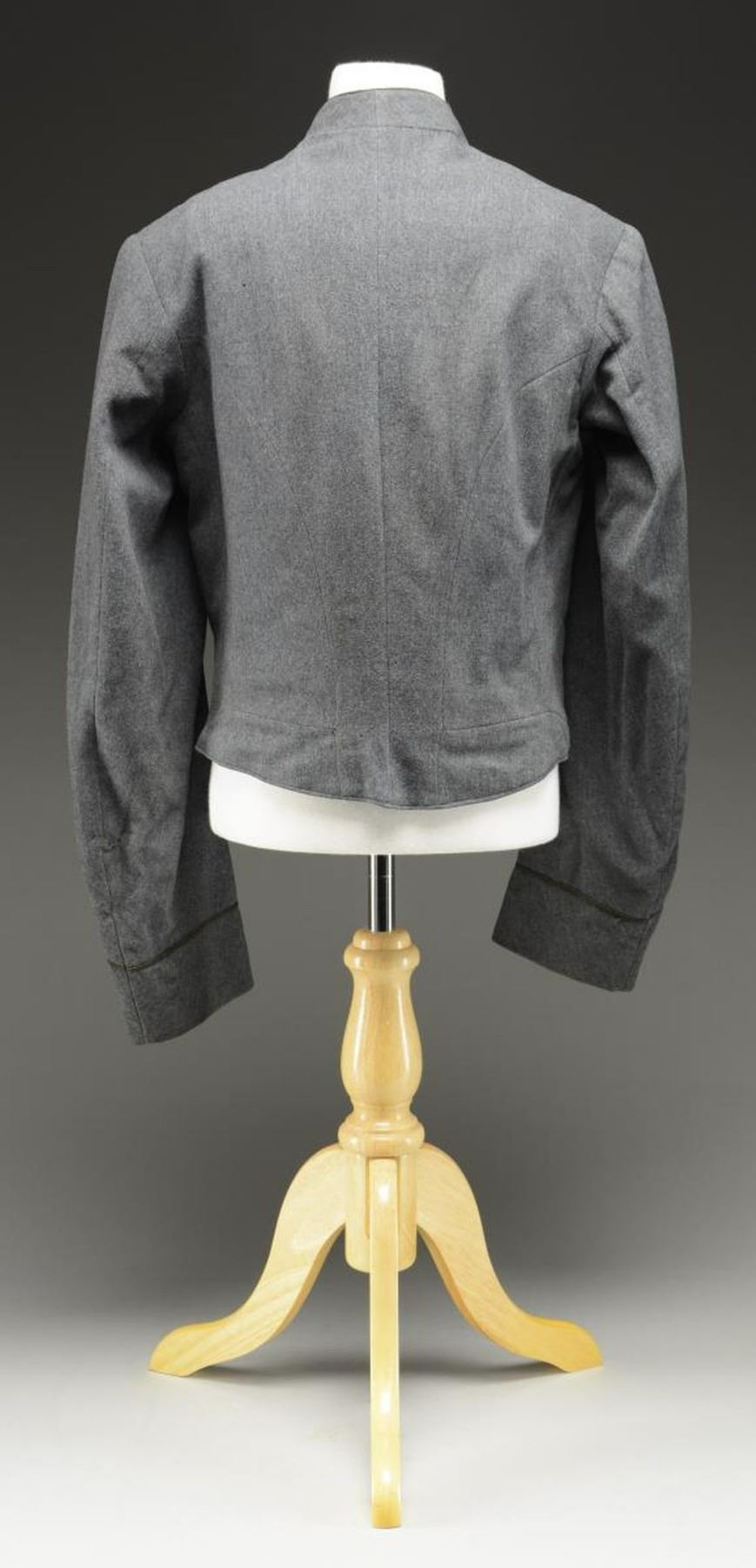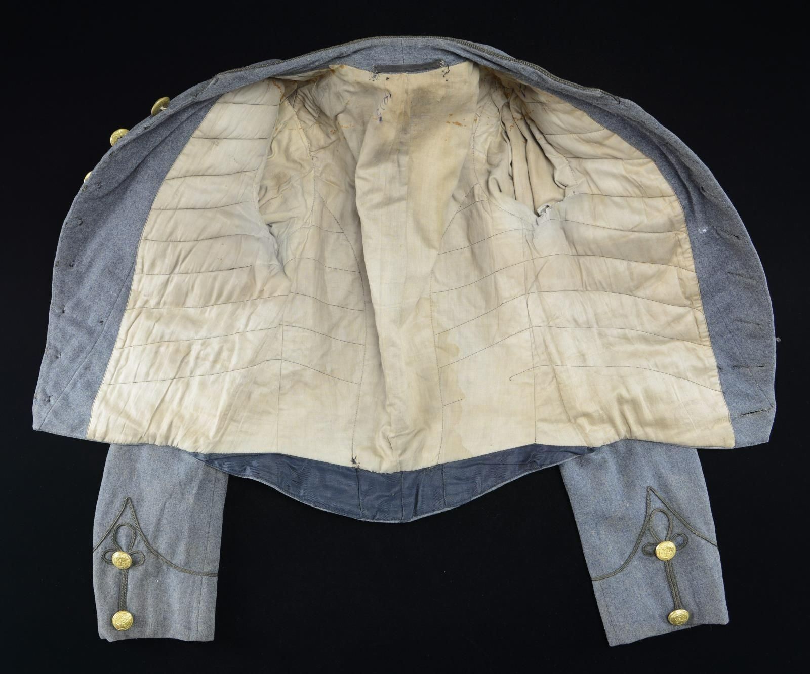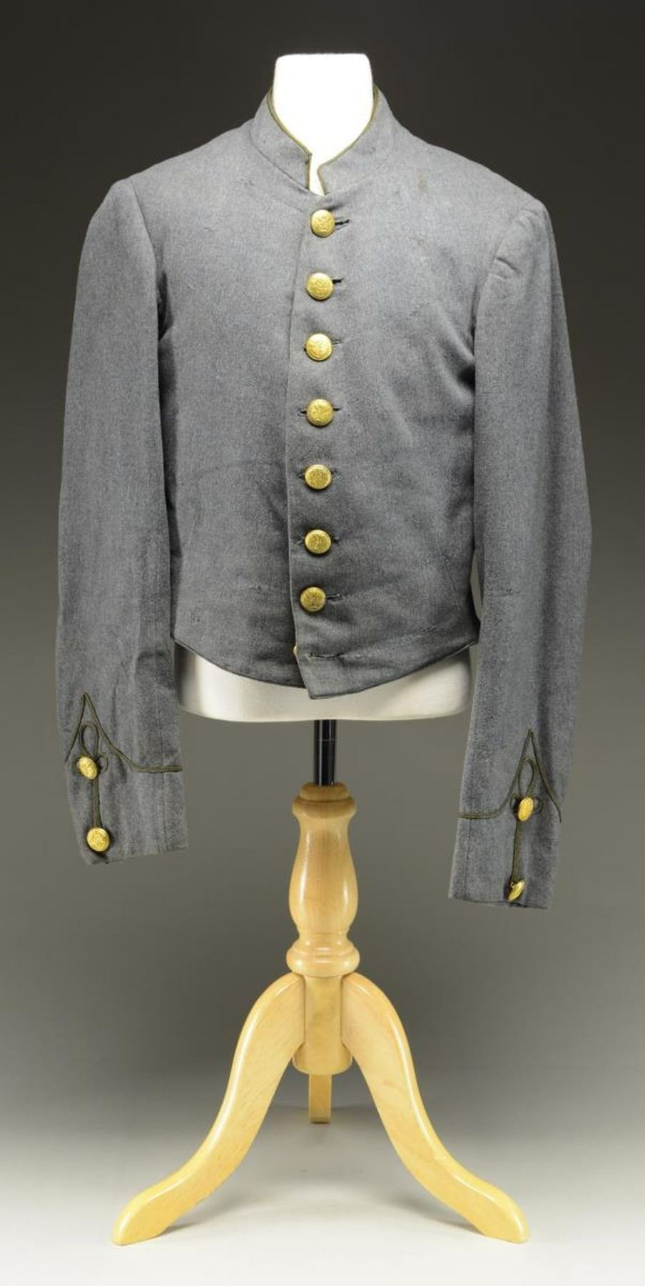 JACKET. The jacket is made of blue/gray wool fabric with 8 buttons down the front and 2 buttons on each sleeve. The buttons are Civil War period manufactured by Van Wart Son & Co. of Birmingham, England. Van Wart manufactured buttons for the Confederacy, but most of the South Carolina & Georgia buttons did not reach the Confederacy in time to be utilized during the war. The collar & cuffs are trimmed in black cord, and there is no decoration on the rear of the coat. Interestingly, the button holes are hand-sewn. The liner is tan cotton and quilted on both sides. The sleeves are lined in the same tan cotton material. There is a number in the interior back near the collar, “1905”. CONDITION: coat shows minor moth damage. The interior has some staining. Overall, the coat is quite solid. (02-20125/BF). $600-900.