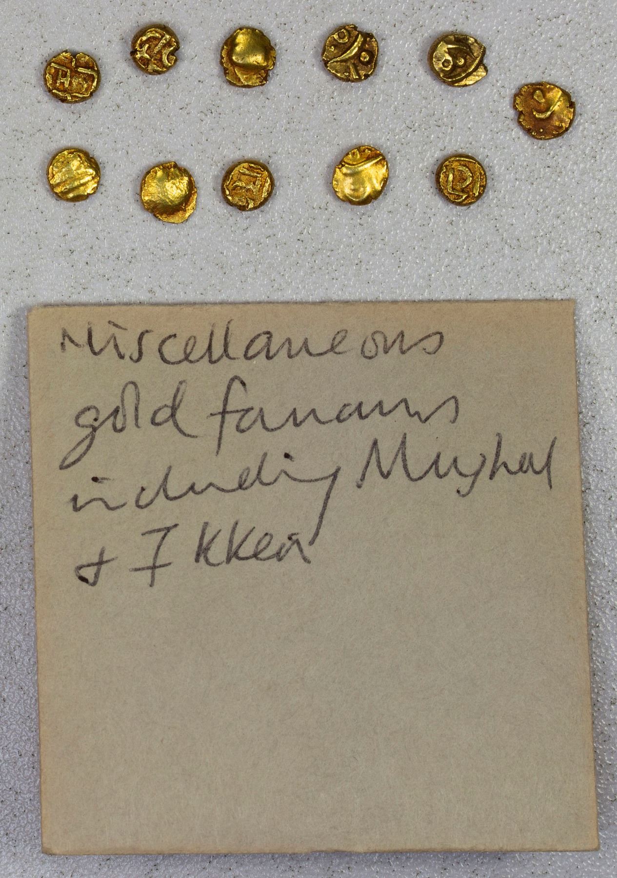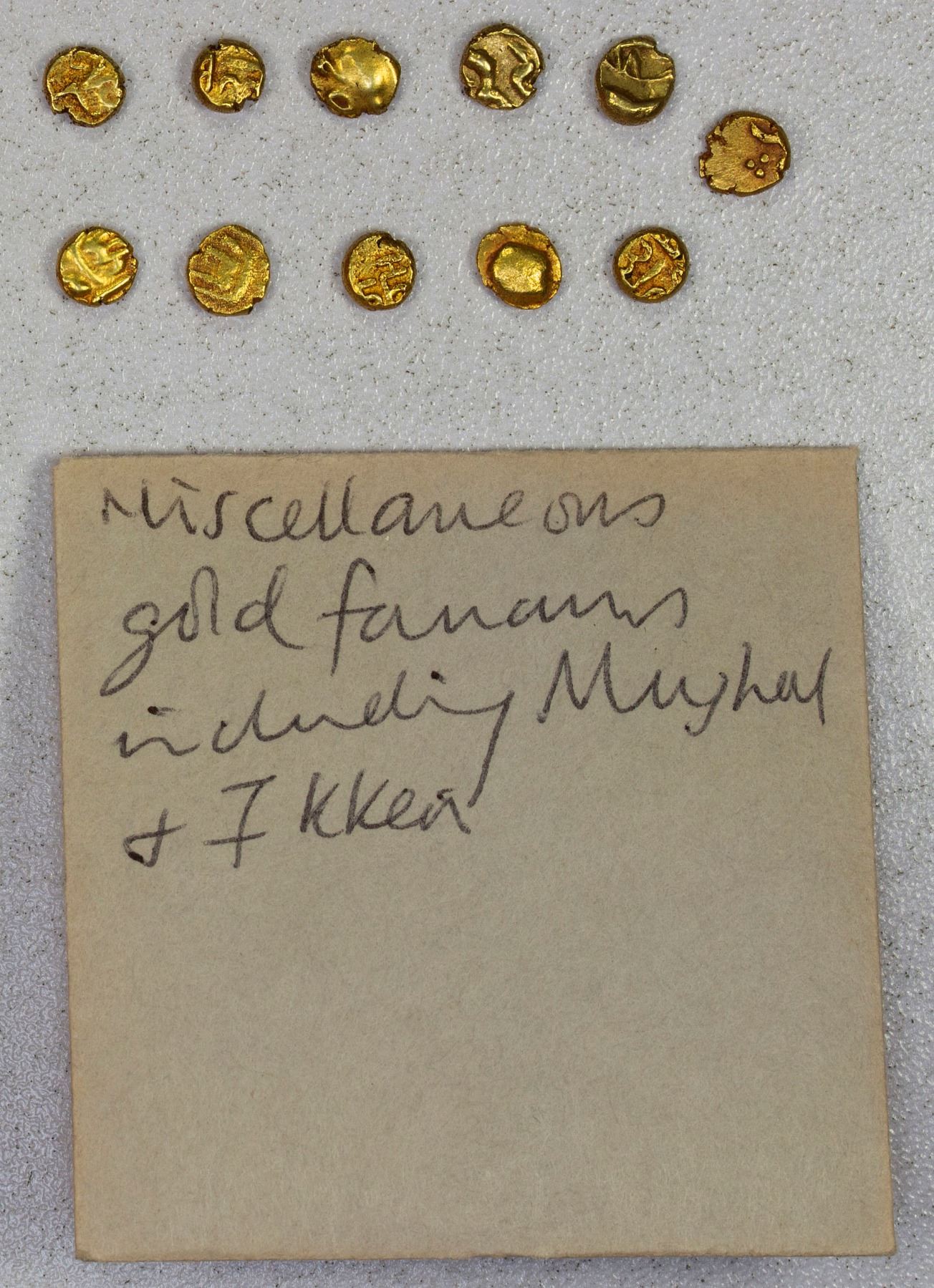 SOUTH INDIA: LOT of 11 AV fanams, including four of Chalukyas of Kalyani (with Nagari la on one side and additional Nagari text on the other, see Marudhar Arts Auction 45, Lot 70 for a similar example), one of Mughal Muhammad Shah (Balapur, worn reverse die), and the rest uncertain types (all in Arabic or apparently so, some similar to Mughal issues of Balapur), total weight 4.02g; retail value $700, lot of 11 pieces.