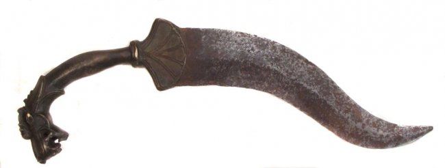 With bronze hilt terminating in a dragon head and recurved, handforged blade.Mid-18th century or later. Blade pitted. Overall length 27.1 cm.