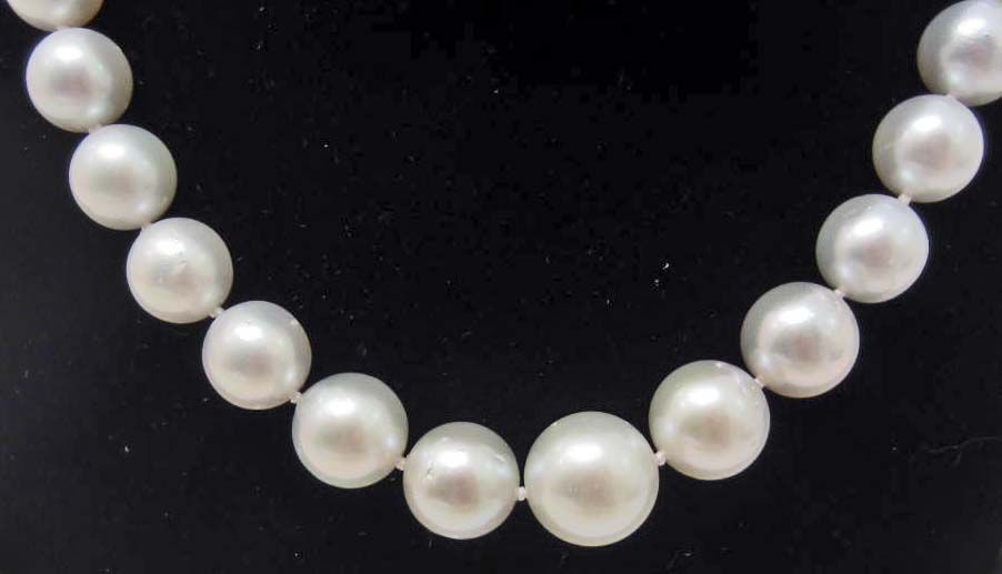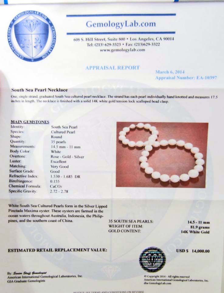 35 South Sea Pearls 14.5-11 mm. Total Weight 81.9 grams. 14KT White Gold Clasp. Appraised Value $14,000.00