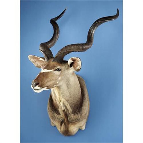 <B>SOUTHERN GREATER KUDU SHOULDER MOUNT</B></I><BR> <I>Tragelaphus strepsiceros strepsiceros</B></I><BR>The Greater Kudu is an elegant and large elk-sized antelope with magnificent corkscrew-shaped horns. Sometimes these horns have ivory tips, as on the present example. Largely nocturnal, wary and alert, it is the Big Gray Ghost of the African bush, highly coveted by all sportsmen. They have a keen seen of hearing with large ears, and their eyesight and sense of smell are very good; the hunter cannot sneak up on one in the thick brush in which they live. This relatively recent mount has superior competition-standard taxidermy and is in mint condition. A mature bull with horns measuring 46 x 45½ inches long around the spirals, it stands 38½ from the wall to the nose, 56 inches high and 35 inches wide.<BR><BR><b>Shipping:</b> Requires 3rd Party Shipping (<a target="_blank" href="http://www.heritageauctions.com/common/shipping.php">view shipping information</a>)