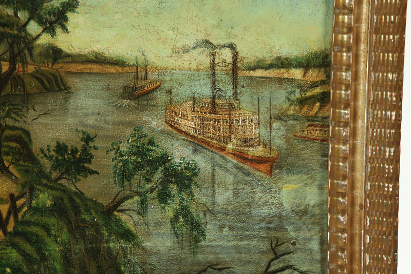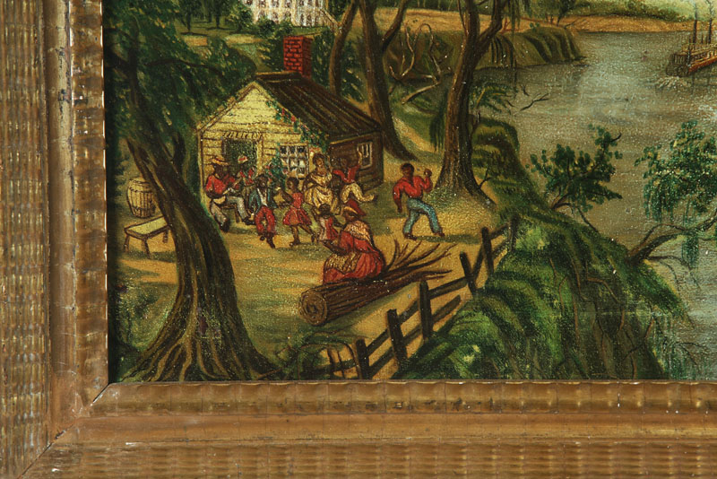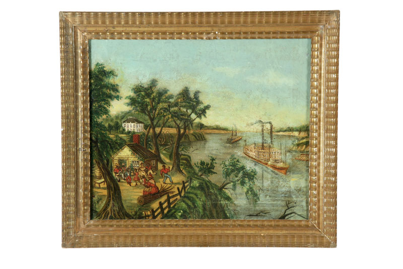 Oil on canvas, unsigned. Plantation house, slave quarters, and two riverboats. Restoration. 17 1/2"h. 21"w., in a gilt frame, 22"h. 25 1/2"w.