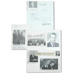 <b>887. SOUTHERN POLITICS </b>A lot consisting of various southern politicians of the 1960s including a nice I S.P. of <b>GEORGE WALLACE</b>, 4" x 5" b/w bust portrait of the Alabama governor mounted to a larger sheet, which also includes a magazine clipping showing Wallace's presidential campaign headquarters, also signed in blue ink. Also mounted to the sheet is a magazine clipping signed by legendary Georgia senator <b>RICHARD B. RUSSELL</b>, and a magazine clipping signed by Texas Governor <b>JOHN CONNALLY</b>. On the verso of the sheet is a T.L.S. of Illinois Senator <b>EVERETT M. DIRKSON</b>, Jan. 8, 1964. With three pieces signed by Arkansas governor <b>ORVAL E. FABUS,</b> including a T.L.S., Aug. 24, 1964, with a signed image from a magazine stapled to the letter, as well as another magazine image mounted and signed by Mississippi Governor <b>ROSS BARNETT</b> in addition to the Arkansas governor. Eight pieces. Overall very good condition.<b>$75-100</b>