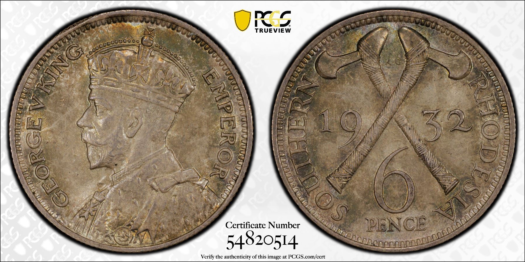 SOUTHERN RHODESIA: George V, 1910-1936, AR 6 pence, 1932, KM-2, a superb example, lovely toning, PCGS graded MS65.