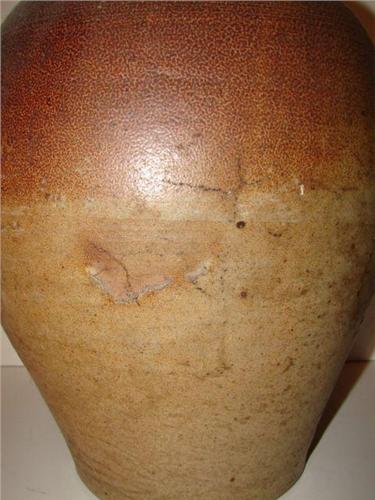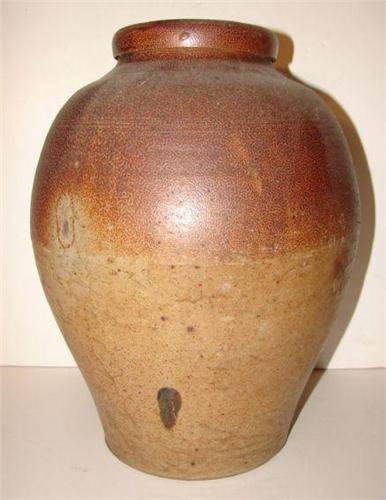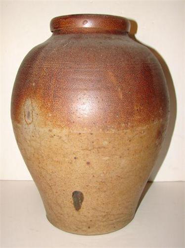 SOUTHERN OVOID STONEWARE CROCK. Brown glaze. Quadruple incised line decoration around top of body. Shows spider cracking throughout. 14” H